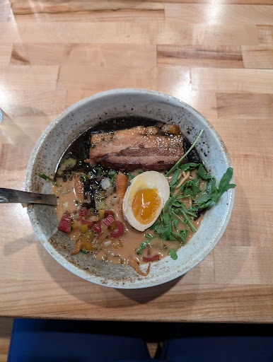 Read moreIf you are a classic ramen-head, this place may not be for you. The broth flavors stray from the norm, which isn't bad, but for the portion and price, I would say it's adventurous to a fault. I was appalled that a basic bowl, just broth and noodles, was $11 and up. All meats, egg, and toppings are served on the side for a considerable amount. I've never been to a ramen spot where I had to order meat as a separate item. My partner (who is a ramen chef) and I sat at the bar. I ordered the Spicy Mushroom Paitan. Received my bowl and was immediately struck by the small portion and HUGE ball of chili paste on top. I didn't think much, figured it would play into the other flavors well. Boy was I WRONG. It was so spicy, the soup was impossible to enjoy. There was no flavor, just spice. I thought maybe it was just me and my taste buds (although I've never been shy about spice before) so I offered some to my partner. He agreed that it was offensively spicy. We mentioned this to the bartender and she sort of laughed it off saying that "some people can't handle the spice." I'm not sure if my bowl was a fluke, but I find it hard to believe that would be the average amount of spice in any given bowl. If that is the average amount of spice...there should probably be a warning next to it. My partner and I are young, spicy food lovers, and we couldn't take it. The bartender was no help in solving the problem, she didn't offer any solutions or good customer service. I was feeling guilty about the prospect of sending it back so I ordered a separate order of plain broth, which barely solved the spice issue. I ate what I could, and left unsatisfied. My partner ordered the Tonkatsu, which was out of the box in flavor profile, and pretty good. He agreed that for the price point, it ultimately was...