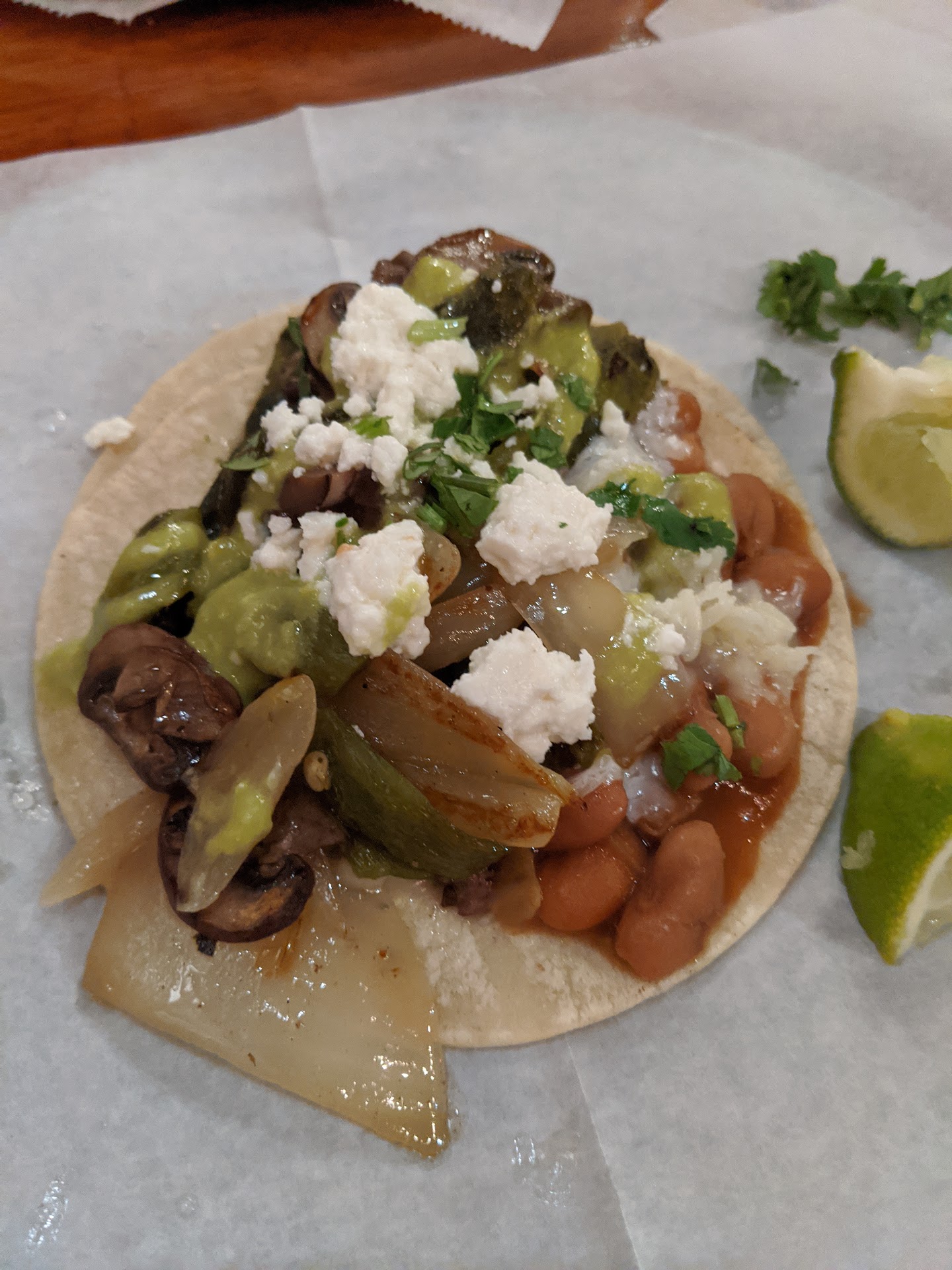 Read moreI am a little torn about this place. On one hand it has an an interesting chill vibe. Big open dinning area and spacious outdoor patio. Based on the menu items and cocktails they are going for a hip upscale Mexican kind of thing. I went with three of their tacos, the "special of the day" carne asada, the vegetarian and the "vampiro". The best of the three by far was the "vampiro" which was Al Pastor with a thick flavorful tomato sauce (like a cooked salsa). Very messy but delicious bite. Unfortunately whatever flavor they put in that one taco they took away from the other two. The carne asada was just dry, tough bland steak with a bit of raw onion and cilantro. A bit of salt and or salsa would of helped this one out, but alas no was provided. Same for the vegetarian. Just bland which should be hard to do with roasted peppers, onions and mushrooms. But it was pretty boring. This place seems like it would be the place to go with friends for happy hour for a few drinks then move on elsewhere for some better food. If they can find some flavor and excitement for their food, this would be a...