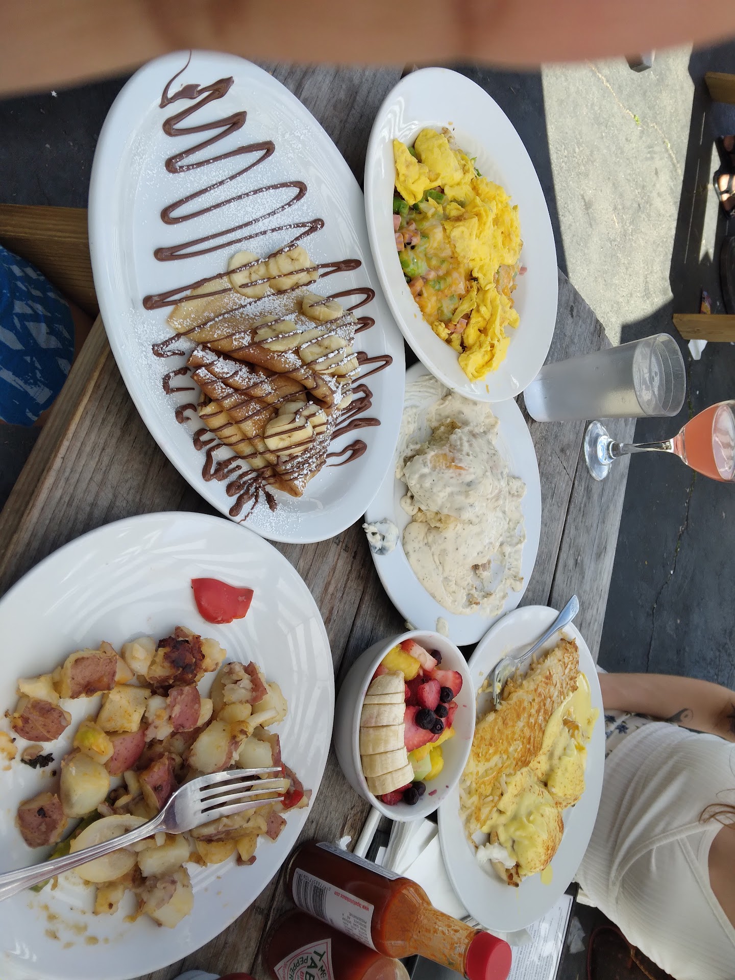 The food was below par for me. Eggs under seasoned, the ham was flavorless and rubbery feeling. The crepes did not have the proper texture they're supposed to. The biscuits and gravy was okay, the fruit was fresh and delicious the potatoes were amazing (food pictured below). We ordered the flirt and the naughty cupid, AND THEY WERE DELICIOUS. Overall the experience was okay. They do need to clean the outdoor area better or more frequently. And yes we still left a good tip and cleaned up behind ourselves. Service workers are...