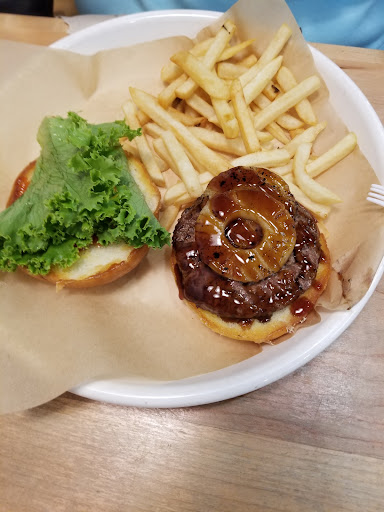 First time visit. Had to see what others are talking about. Good fresh ground beef burgers cooked on a unique rotating grill. Buns were freshly toasted and held up well to juiciness of the 6 oz. Burger. I ordered the bacon mushroom with swiss cheese. Added grilled onions which I should have left off, as they were overly pungent and as dry to be tough chewy stringy. Happens when too much outer peel is left on onion and dry grilled with no moisture. Condiments bar was good. But for the price you have to build your own burgers. Fries were hot and tasty. Fountain root beer was sweet. The other order was a blackboard offering of a Teriyaki burger with grilled pineapple . Liked the Teriyaki glaze which was just right. Only complaint was it was not cooked medium as requested. A little more med rare. Again fries were hot and tasty. Loved the peanutbutter shake. Very good exactly as what was wanted. Do not think of this place as fast food. Orders were taking 25-35 minutes. Other would be customers left after standing in line and then told before ordering that it was a 25-30 minute wait for orders to come up. Yes it was early Friday night 5:30 pm and definitely took 30 plus minutes to recieve food after ordering. Good food. Nice courteous employees work here! On leaving, I disliked the sticky floors under the table and at dish recycle and garbage...