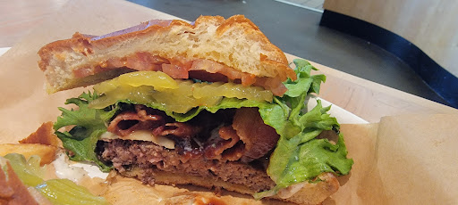 Cons: Very pricy. The menu is super confusing. The bacon is too crispy and cooked into a ball that does not lay well on the sandwich--and it is cold. The toppings bar is a good idea, but such a hassle. Sometimes I just want to eat my burger as it is handed to me.