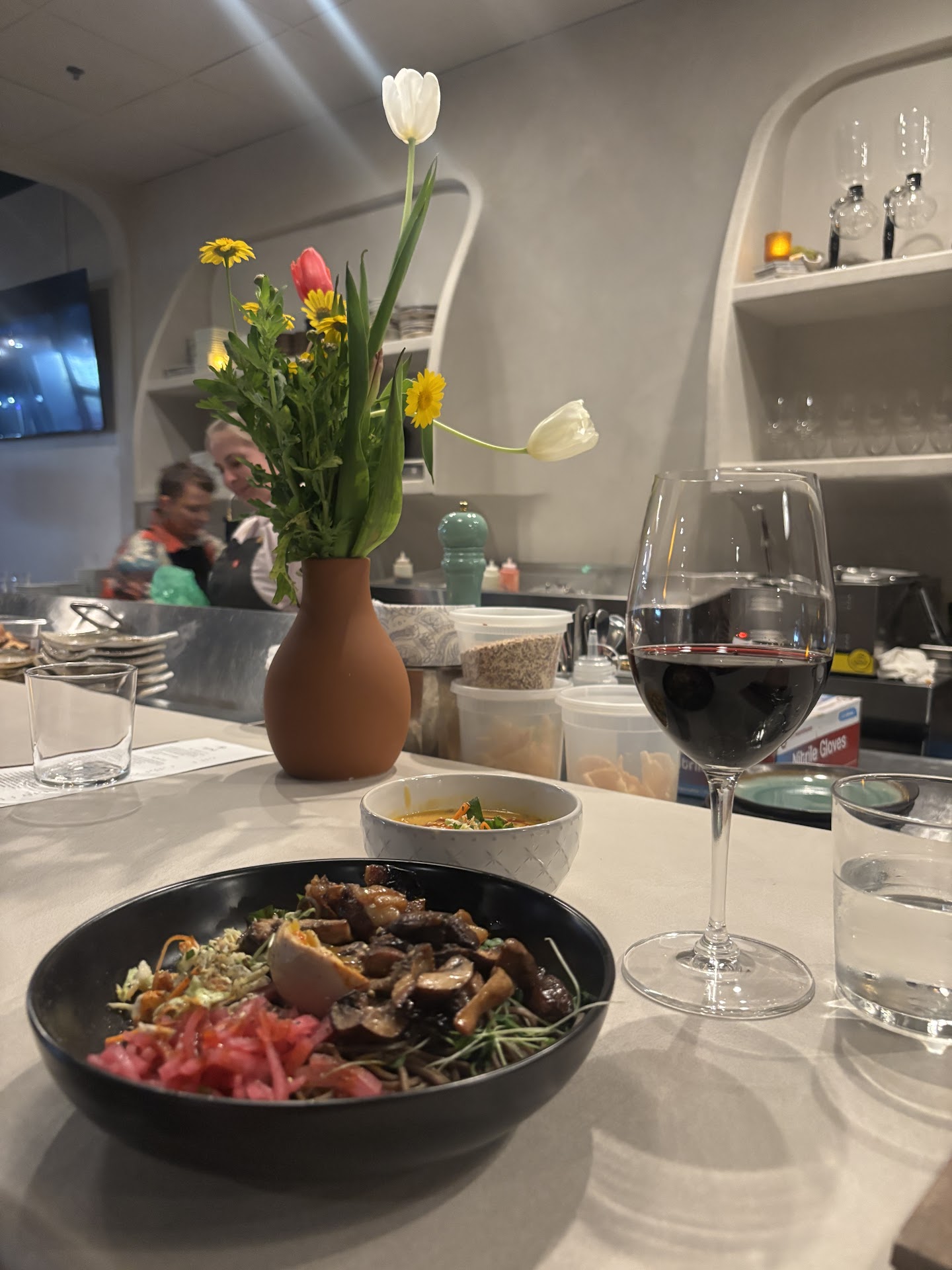 Let us start off with the Ambiance of the restaurant. The space has dim lighting which is nice as it creates a soft atmosphere for the restaurant. The details of the chairs and tables like fixtures and even the glasses that are used are very clean so it gives the restaurant an upscale feeling while still being cozy. There's also a small section that seems to be a private wine display that everyone can look at and potentially walk into if you would like.