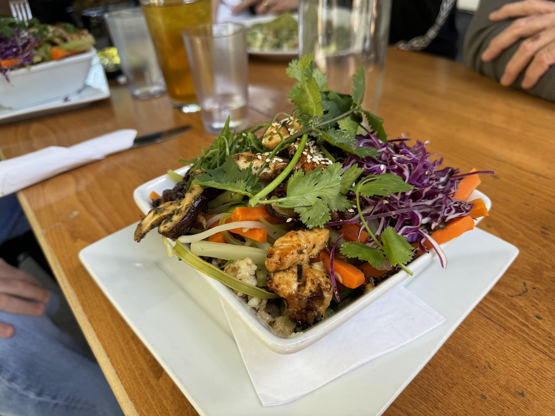 Our food arrived hot from the kitchen within 15 minutes of ordering. I ordered the vegetarian bowl but added grilled chicken protein to it. It came out great! Presentation is spot on and the taste was excellent! Perfectly seasoned and not too saucy. Chicken was delicious. Definitely a solid 5/5.
