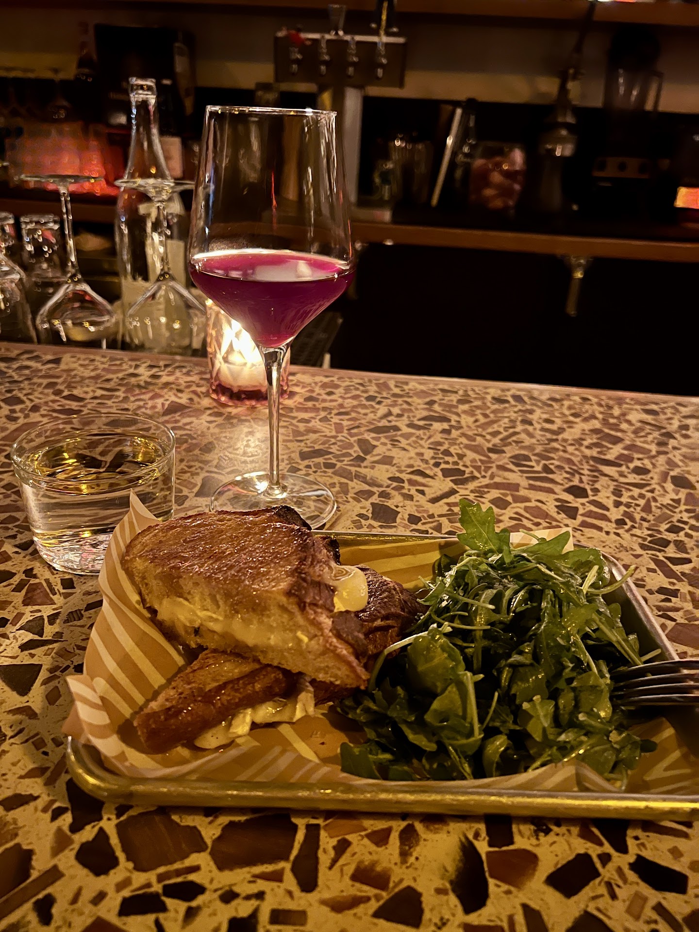 Simple food made extraordinary via detailed culinary arts and talent. I wish I got more photos. Never had a better grilled brie, I think they first pan fried the ham. The almonds inside offered elegance. We ordered a handful of items, the tuna sandwich not shown, was different than any other tuna I’d had before and I don’t know how they cut it (and so beautifully stacked) without the ingredients spilling out. We polished off everything with our friends, who were there to celebrate a birthday. Kitchen staff deserves a lot of praise. I was not expecting a wine bar’s food to outshine their beverages, as beautifully curated as they are. Nicely done! My only question is, can you find some tiny tables to add to seating on the bench so there can be food served there too? I hear it gets very packed in, like the cans of sardines you serve, and I understand, but maybe something you can remove easily when space is more important than serving nibbles? I knew better than to bring a group, but would love to take a few more friends next time. Great service, friendly and helpful. Clean and uniquely styled bar....