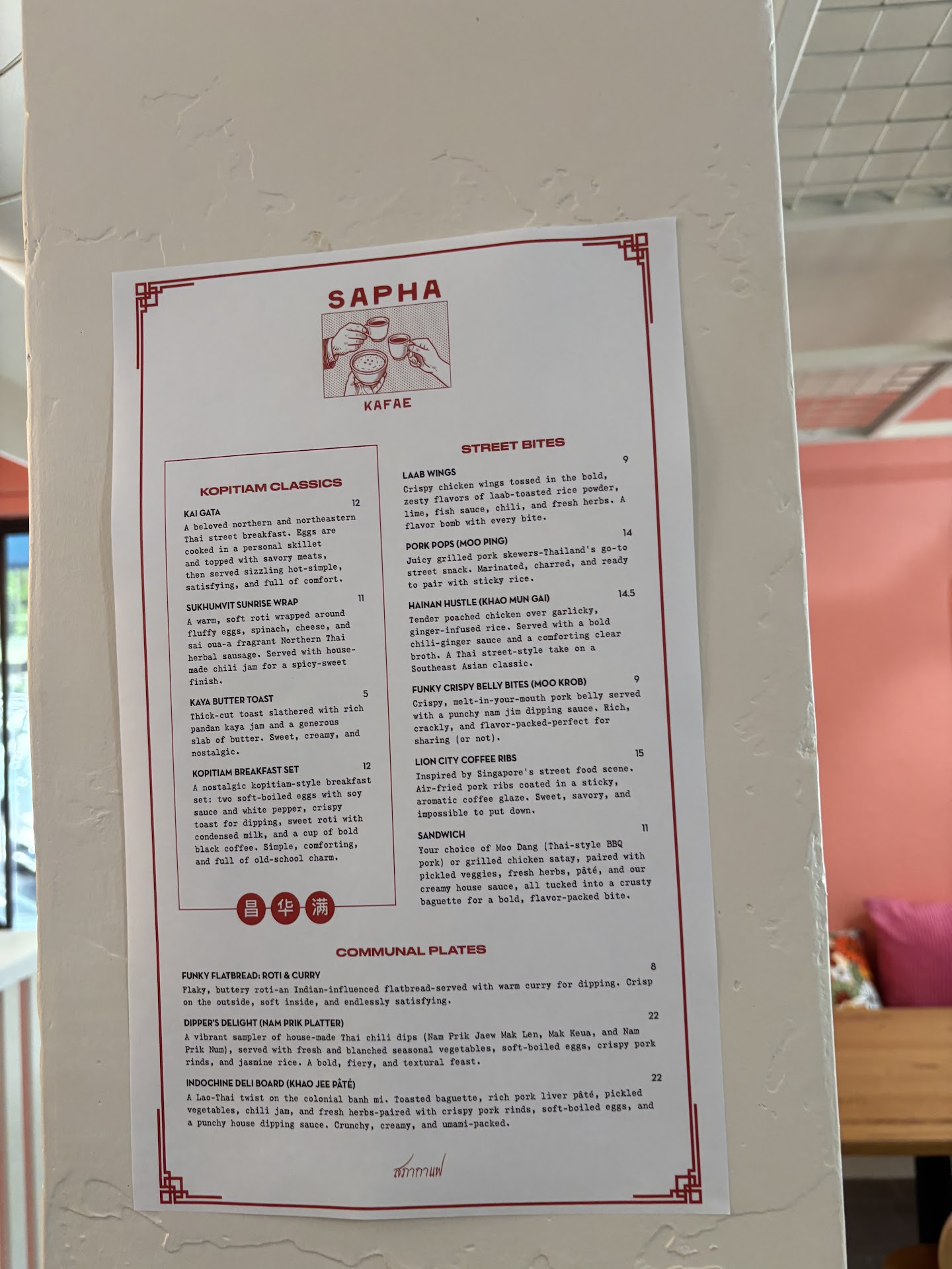 The menu is innovative, a fusion of modern Thai street vendor food. I am eager to come back and try other items. They serve coffee...