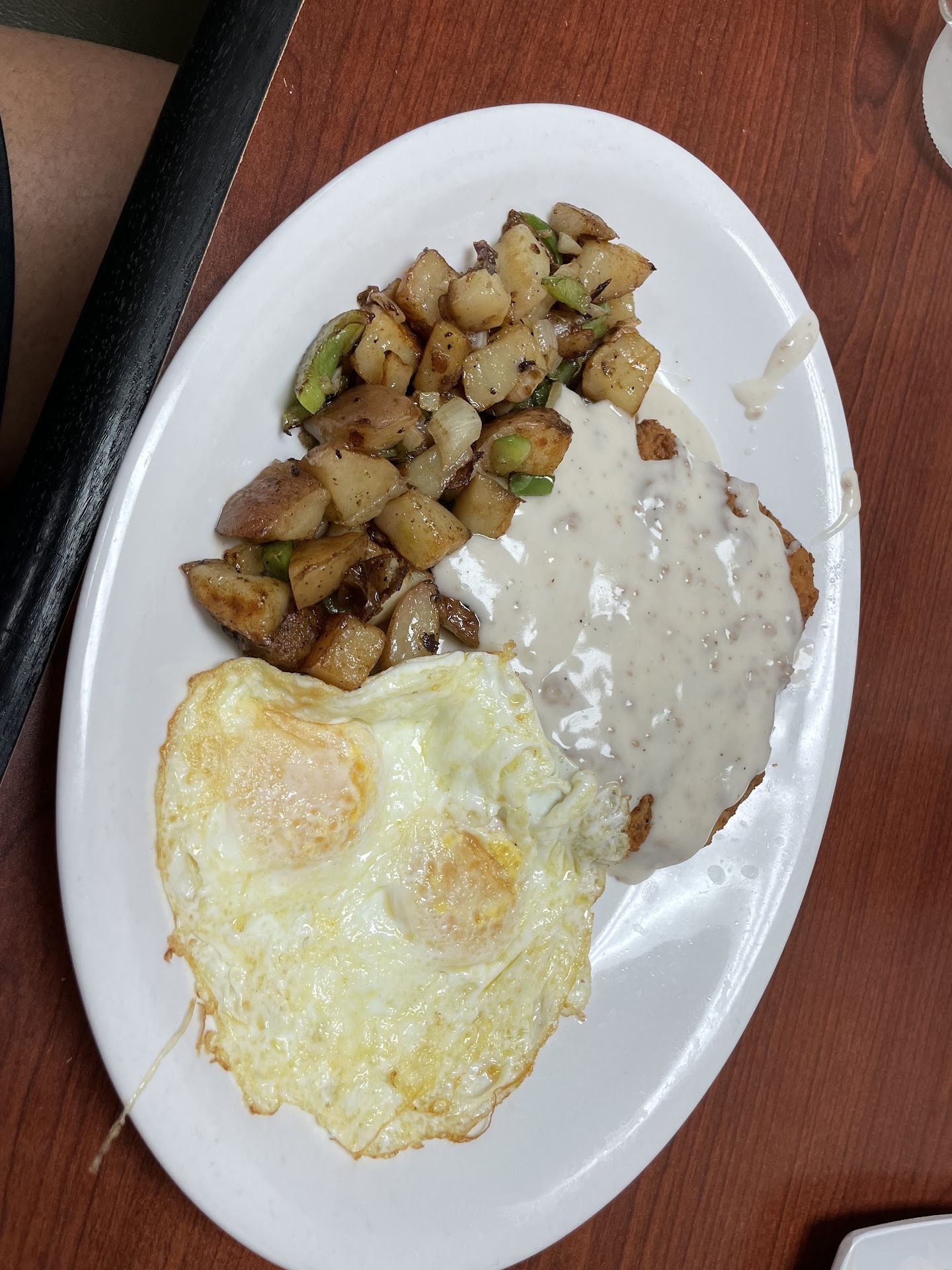 The main parts of the meal were great, the eggs and sausage and the eggs and country fried steak. The breakfast potatoes were also seasoned very well and very flavorful. The hasbrowns were cooked to my liking but really lacked any flavor, which was interesting because everything else was so well seasoned.