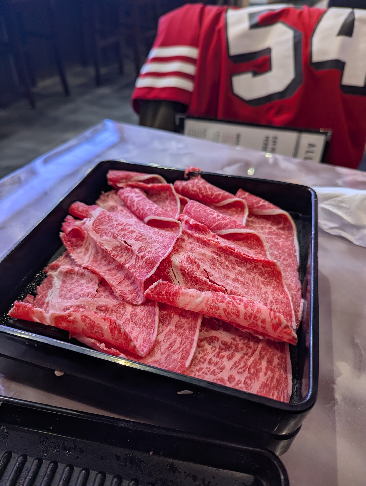 The Ă la carte setup includes a soup base, a bowl of veggies, your choice of carbs, and a protein. I chose the 8oz wagyu ($26), ramen, and spicy tonkatsu broth. The broth was actually spicy, which caught me off guard because Japanese spicy usually means âmildly concerned paprika.â The wagyu was perfectly fatty and delicious. Itâs shabu, so you cook it yourself. If you overcooked it into sadness, thatâs on you. No sympathy.