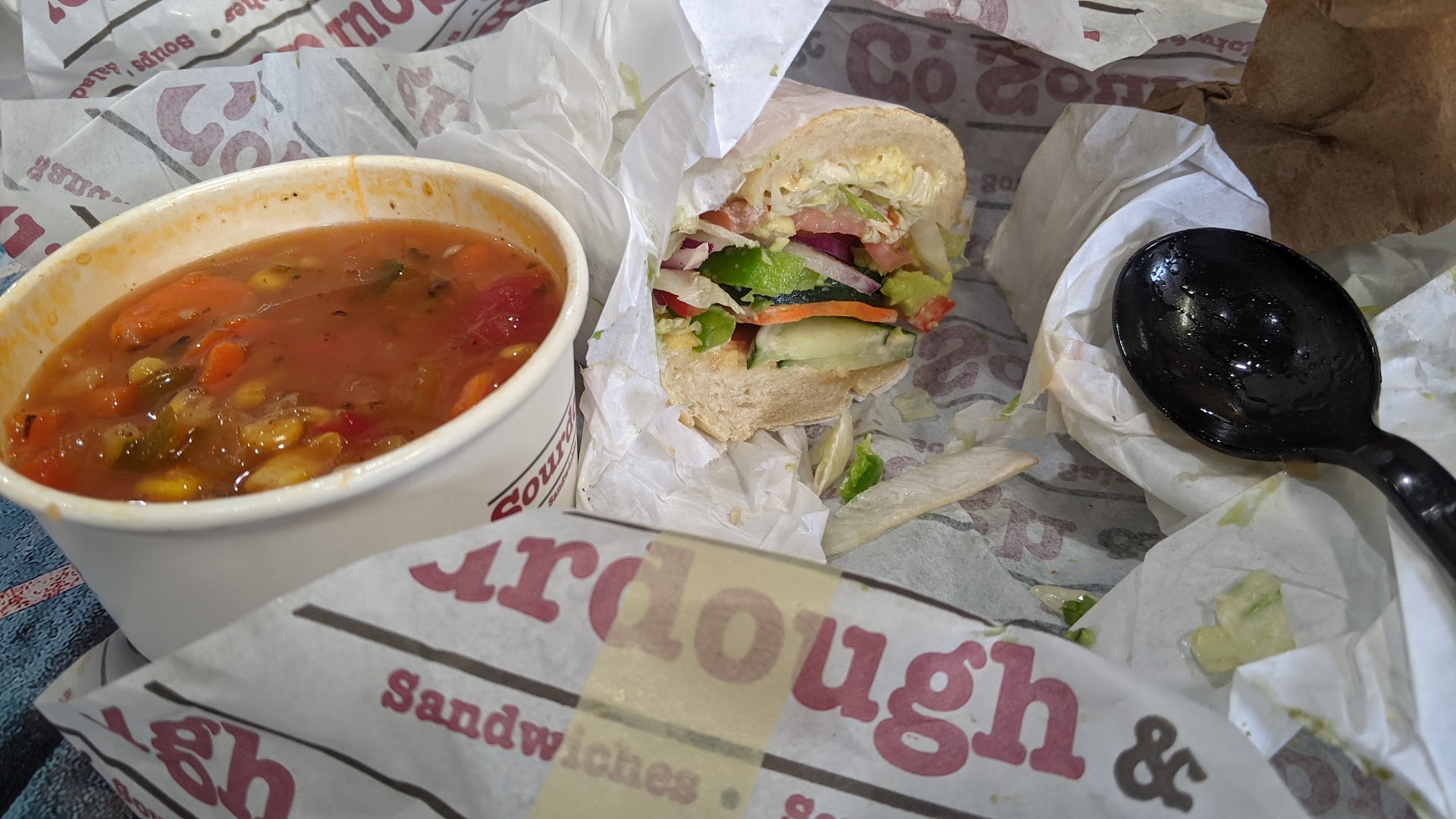 Read moreGood food, inside the station, vegetarian options and good service. We got a Reuben and a Veggie, and they were good sandwiches. The sourdough was a good texture, crisp outside and tender inside, the Reuben had a lot of mustard but wasn't bad, the veggie comes with avocado but no protein unfortunately. There is also cheese and mayo on it default so if you want it vegan just order without Mayo and cheese I think. The fire-roasted vegetable soup was good and had A LOT of veggie chunks in it which was great. Coke products and Mr. Pibb too! I liked the number of selections they have and the staff was very friendly, helping a younger customer figure out her order...