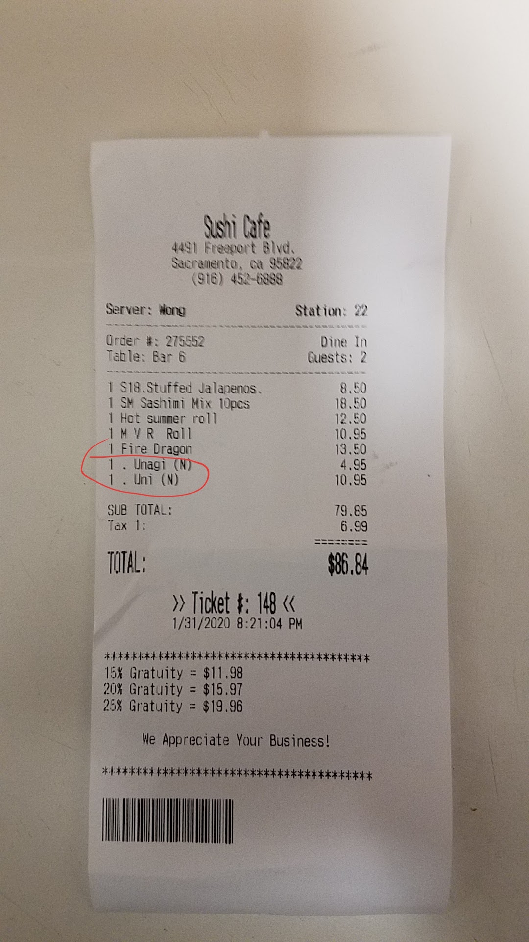 Read moreOkay at first I felt bad for posting this because its at odds with so many other positive reviews but apparently many of the negative Yelp reviews also speak to the same problem. Girlfriend and I sat down at the bar and ordered 2 appetizers and 3 sushi rolls. We got the first appetizer straight from the sushi chef which looked odd, but my girlfriend thought it was what she ordered. After one bite i noticed our waitress talking with the chef about how the appetizer was supposed to go to the couple NEXT to us instead. Whoopsie. Well, as the night continued they left the appetizer with us, and there were no other mix ups. We ate it, the rest of our sushi, and NOTHING was said to us about having to pay for their mix up. Finally at the end of the night the waitress spoke with the chef before bringing us the bill and we found we had been charged for the appetizer. We spoke with the waitress asking why we were being charged for the appetizer and were told after speaking with her boss she was told to add on the appetizer. Rather than press the issue we just chose to pay to leave. Needless to say, we won't...