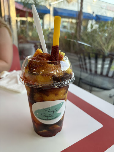 The inside is small but thereās booth seating and they have some seating outside. The inside is pretty clean, tables can be sticky, and the parking lot is pretty small but if you go in the afternoon you should be able to find parking. Itās a nice spot to eat at when you have either something simple or a loaded dessert...