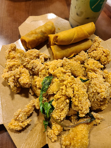 They have popcorn fried tofu...and other snacks, but Im a vegetarian so it's all about the tofu, which is great especially with that wonderful sauce plus they have like a zillion different types of teas. The place is clean, food and tea are wonderful, yet there are a couple of draw backs which is why I didn't give it 5 stars: it's across from the high school so any time like after 3 the place can be packed and loud; and because the staff is also very young their music choices can sometimes be inappropriate for a place of business (went there last Tuesday around 5 and it was packed with kids and the music was blaring rap that contain lyrics with b*h in it. I kept hoping they would change the music but they never did so I left without ordering. Went back today right before the high school kids got there and it was all good. Definitely worth...