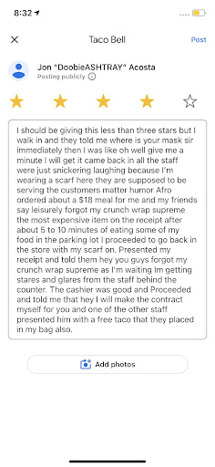 Read moreI had to delete my old review. Because for some reason, it wouldn't let me update it. It's fine to be honest. What I have to say now is more important than then. The survace is still garbage and they still get the orders wrong and even when there is no line it takes a long time to finally get your food (the Denny's down the street gets our food out faster than they do here) but all of that is NOTHING compared to what those poor employees have to suffer from!