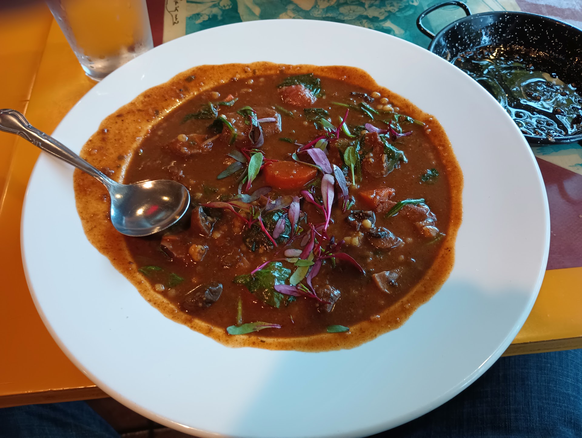 We started with a pitcher of sangria and two tapas: Patatas Bravas and Kobe Beef. The sangria was refreshing, not too sweet, and exactly what we wanted on a warm day. Both tapas were excellent. The Patatas Bravas were crispy with just the right spice, and the beef was tender and flavorful. The soup of the day was another pleasant surprise.