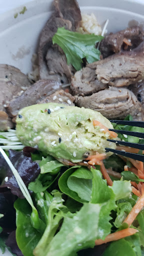 So as my husband drove off, I dug right in. As I opened, the meat was not seasoned in that ginger savory flavor. It was cut in thin slices. I've never seen it cut in this way. Usually thicker so it's not dry and the pieces i got were super dry. The photo says it all. The avocado that was given to me also had a lemon flavor to it. Imo they squeezed lemon juice on top to prevent browning? Usually it's freshly cut and into slices but I just got a mushed quarter scoop of avocado.