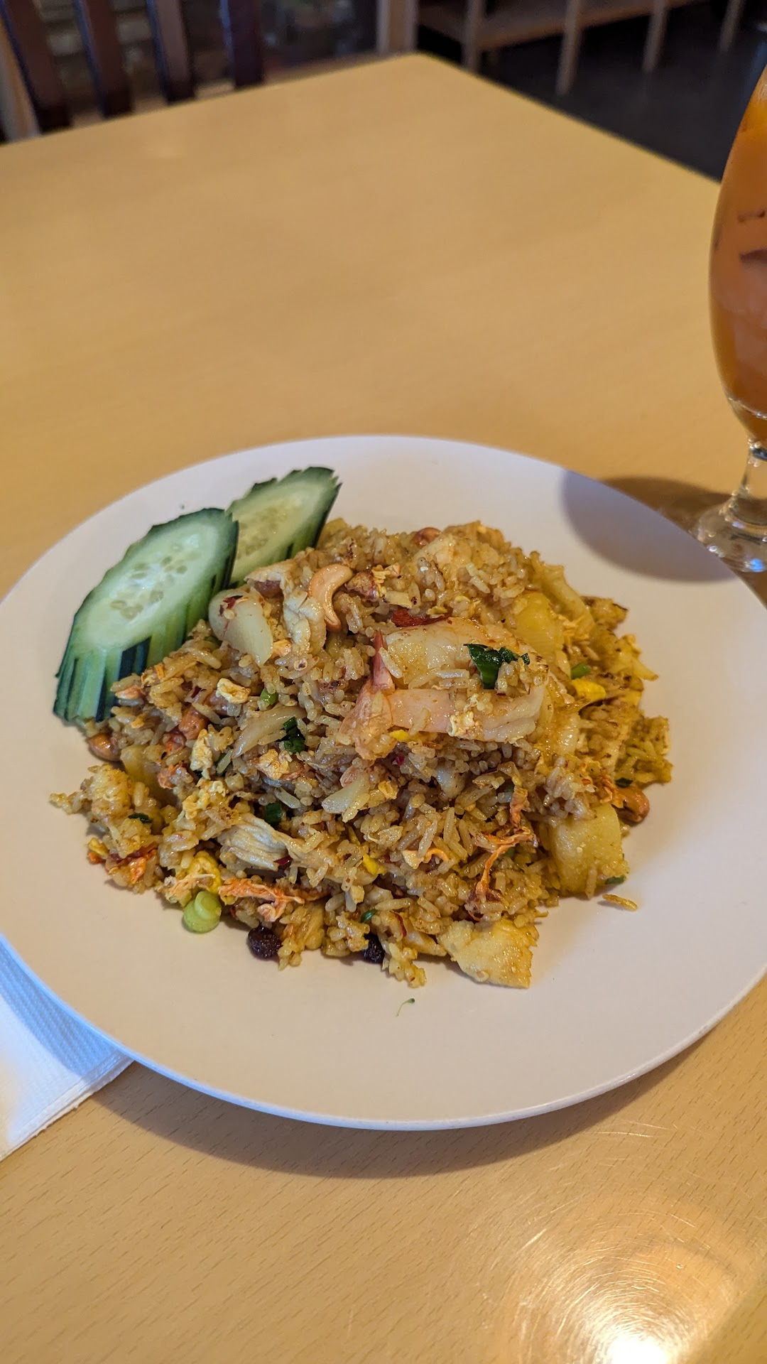 Read moreI came here to eat some pineapple fried rice, my go-to when eating at a Thai Restaurant. When I got it, it was good, but I felt that there were a bit too many things in the rice that tasted differently. There were cashews and raisins along with the spices and other ingredients used. They put shrimp and chicken in the rice as well. I felt that the raisins gave the rice some sweetness that didn't belong. Personally, I feel that the raisins and cashews could be left out, but someone else may like it that way better. I also ordered Thai Tea. It was served to me mixed. I would have preferred to mix it myself but it is no biggie. It was $4 for the Thai Tea and around $16 for the pineapple fried rice. I would come back to try other dishes, but this one may not be my favorite here. The workers were kind and the place was clean. I hope to...