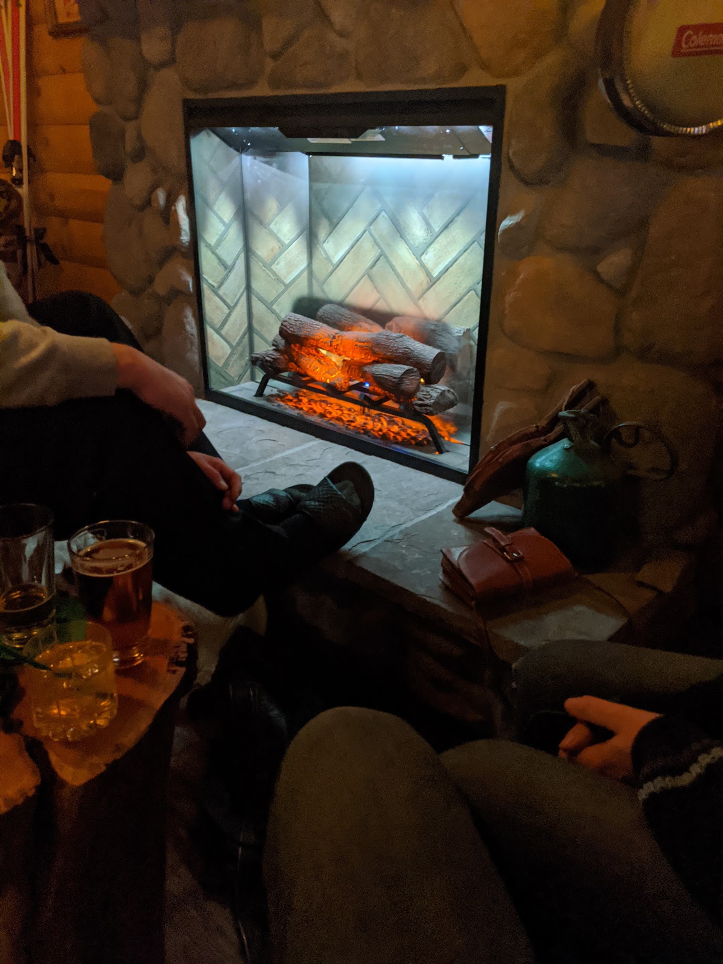 One star docked because: the fire place was broken they were showing some cheesy fire station tv show on the 3 TVs in the bar with volume up. I know the NFC championship game had recently ended, so they must have just not changed the channel yet they only have s'mores kits or spicy nuts to eat on the menu, so there isn't a draw to stick around beyond one...