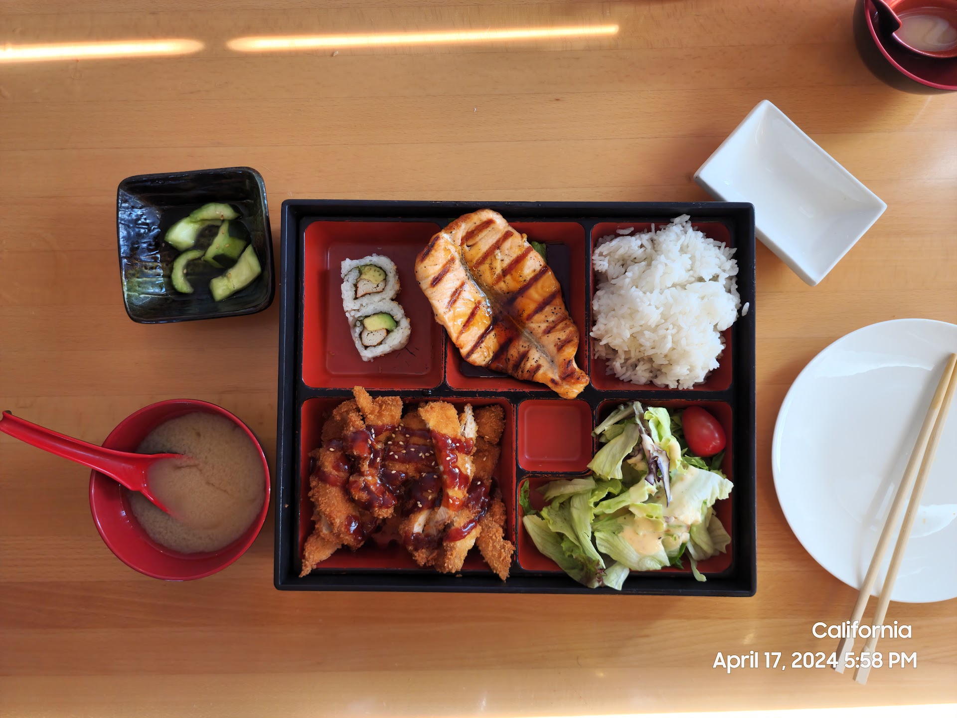 🐟 Salmon Teriyaki 5/10 - Light teriyaki, the grilled fish flavor is the prominate flavor. Ends with the aftertaste of the grills char. It's ok, I think the sauce needs to be thicker. Due to it being low viscosity, the sauce runs off the fish rather than having a sticky coating on it.