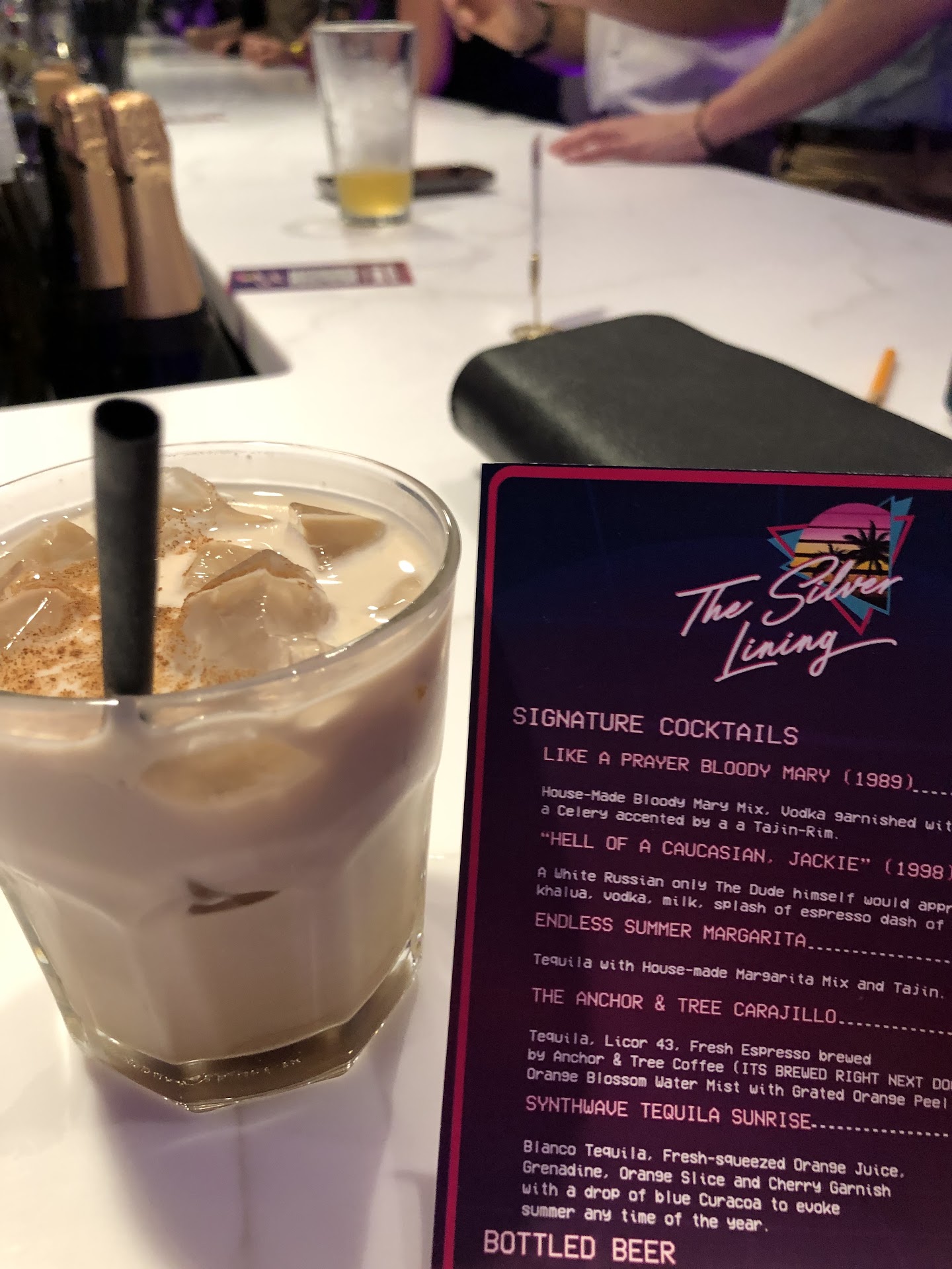 Eight of us went to the ticketed dueling piano event and absolutely had the best time ever, in fact all of us could not remember the last time we had such a blast. Smiling, laughing, dancing, and singing! The drinks are fabulous and have some great creative names to the signature cocktail. The staff are so friendly and the Owner ROCKS! He even got on the piano to play! His creation the the first dueling piano bar in Sacramento is so genius and offers something that enhances the Sacramento night life! The atmosphere of the whole place has a great vibe. Retro, sunset, pink lights, an awesome pink palm feature wall, people there where just there to have an awesome time. The dueling piano event ended at 11pm but the bar remained opened after and it was nice to be able to remain there and sit and chat with friends after the event. We did not have the food there because we went to dinner before hand but I do know they have some small offerings. We saw a few plates being served to tables. 100% recommended anyone to check out The Silver Lining⊠it is a place to hang, a date night, a girls night out, and/or even an adult...