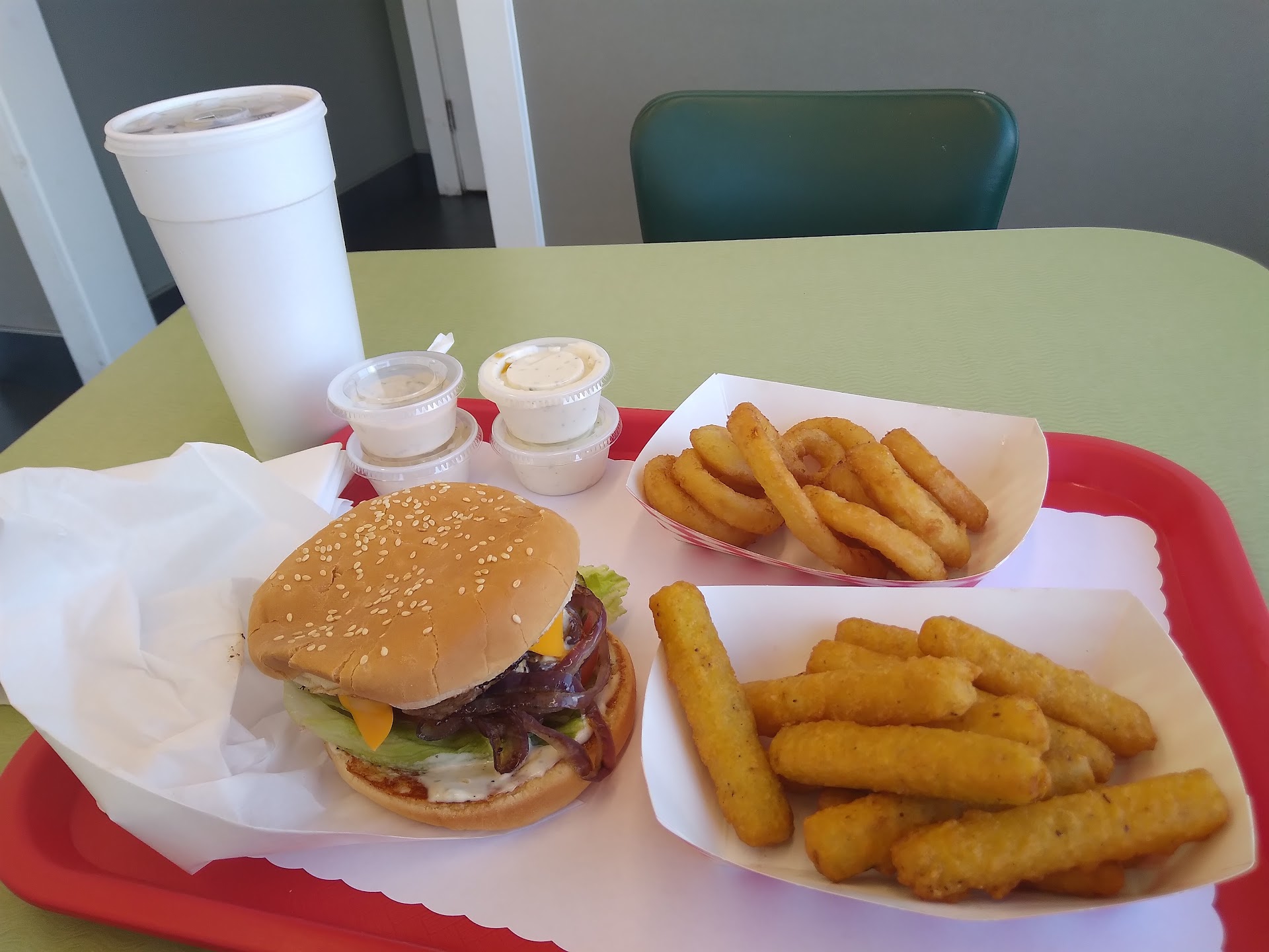 I ordered the cheeseburger with grilled onions meal and substituted the fries for onion rings and also ordered the fried zucchini. Usually ranch at places like this is my favorite, however, when I dipped one fried zucchini in the house made dressing and ate it and it blew my mind because it tasted so good and also had to wait a little bit from eating the zucchini because it was still hot and fresh that I burned my mouth. The house made dressing tasted like a cross between tartar sauce and ranch. Super delicious amd definitely my favorite now!
