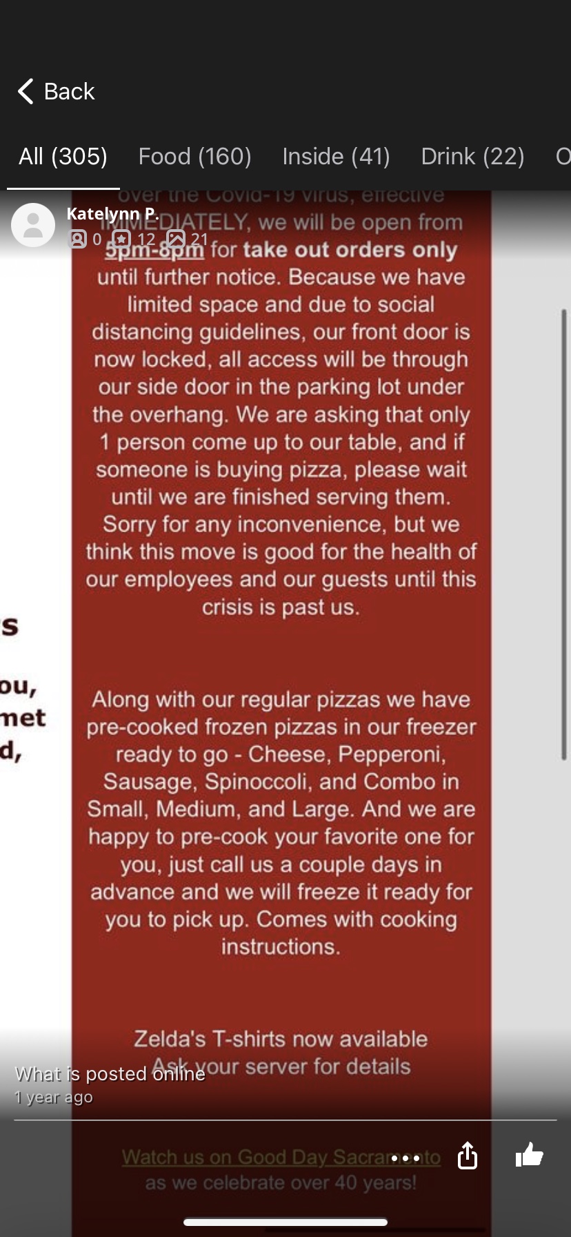 There are many other choices for pizza where there owners are gracious, pleased for your business and deliver delicious hot food even because of the same governmental demands they also face. It is unfortunate Zeldas has devolved so far and how this owner, that replaced the hard working and so friendly Zelda , has not kept her historic food quality and service up to standards Sacramento has enjoyed since the late 1970's.