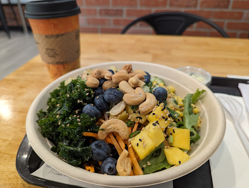 We dined in and I found it the restaurant to be very clean and bright, they have free wifi. The food came out promptly. When I didnt have my face in the bowl shoveling their mouth-watering teriyaki bowl into my face, I found the staff and overall logistics to act like a well oiled machine. Staff was really friendly and made great recommendations (like adding spring greens to my bowl). Parking was easy and plenty of options.