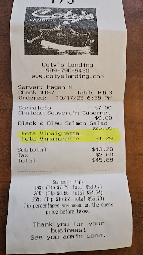 I have gone to Coty's several times and the food and atmosphere are normally fantastic. Yesterday was unfortunately more than a poor experience. There were 4 of us and I ordered the Black and Bleu Salmon salad and drinks. When we received our meals, my friend went to grab her silverware and my dressing accidentally spilled. We cleaned it and asked for a new side of dressing. The waitress said she would have to charge me. I was confused why I would be charged for the dressing and I politely asked to speak to the manager, and the owner came over and asked how she could help. I let her know what happened and she told me I would have to be charged. I said it spilled and she told me if someone wanted a second dressing, they would be charged. I explained that was not the situation here, and then she said "I'm not in the business of giving out free food". I was baffled by the response and stated that I am paying for a $26.00 salad and it was an accident. I asked her for the cost of another dressing and she said between $.50 and $.99, as feta vinegarette is the most expensive in her words. Well I was charged $1.29 for my side of dressing. It is not the cost of the dressing but the condescending statement she made as though I was trying to get "free food" with a side of dressing and was also an arrogant way of letting us know she does not mind losing our business. In all transparency there were no inappropriate verbal exchanges, the waitress was nice and did a great job, my friend left a ripped dollar bill on the table (she was upset), and I tipped the waitress. From my receipt it wasn't the $1.29 charge that was concerning, but the principle and ridiculous and condescending statement from the owner herself. Many blessings to her and...