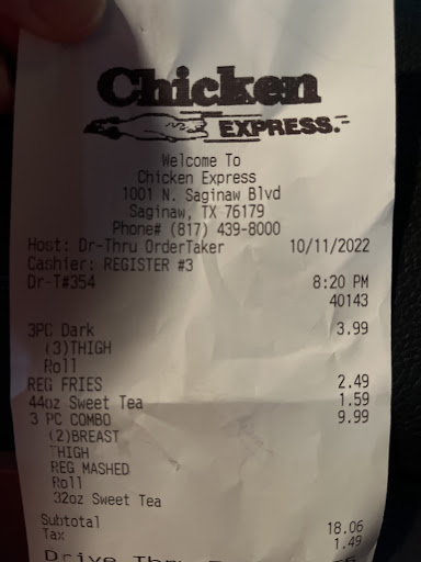 Read moreMy food has always been in check for Chicken Express.It is what it is. That being said, I always go through the drive through and there order checking really needs to get in order. I have had things forgotten on most every visit. Tonight I went inside so I could spread things out and verify I had everything that was ordered myself. I told the girl working the cash register my order and that I was shorted a roll last week when I went through the drive through. Her response is what triggered me to finally leave my opinion out there for others. She said well I can charge you for a additional roll if you want another one tonight! I just told her OK!! Yeah lets do that and repeated my order to her with the dipping sauces I was requesting. When I got my order I laid it out on the counter and did not have one of the dipping sauces I had requested. A trivial thing that I was not charged for but still yet another instance where my order had not been verified by this location. So all in all not a bad experience tonight but guys you need to train your employees to care. This young lady was just going through the motions as it seems so many of your employees do. Just waiting for the clock to go on not enjoying there day or caring about others just pushing through the struggles of doing there job. Make America Great Again! Yeah right, your folks struggle to get...