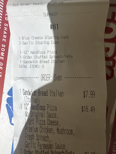 Read moreThis store's manager (Kim) doesn't understand the meaning of customer service. My son place the order on the Dominos app. The app told him the pizza was put in at 6:12. I arrived at 6:25 to find out that my thin crust pizza was made, but they needed me to wait 5 minutes for the thick crust to come out of the oven. I waited the 5 minutes and then when the kid behind the counter checked again, that pizza was given away. I was told that I would just have to wait 10-15 minutes for another pizza to be put in. I waited. By the time the pizza was done, my thin crust was cold. I asked to speak with a manager. They said I would have to wait for a few minutes because she was making pizzas. I waited another 5-8 minutes, before they yelled back to the manager reminding her I was waiting. She says again, she's just going to have to wait because I'm making pizzas. Granted the store was very busy on this Friday night, but she had more than a dozen workers back there. There is no reason one of her other workers couldn't make the pizzas while she addresses my concern about my cold with very burnt edges pizza. Don't be surprised if you receive very lacking customer service...