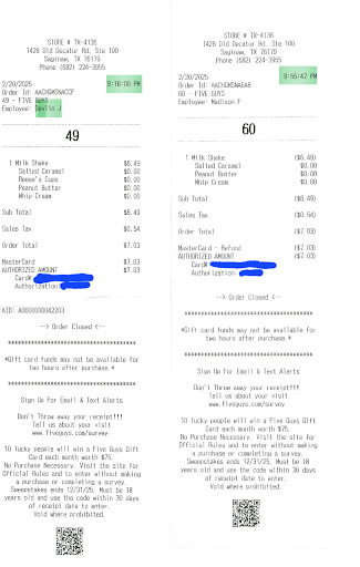 Read moreI’ve visited Five Guys in multiple states and numerous locations, but this was by far the worst experience my spouse and I have ever had. We stopped by for a late-night shake on 2/20/2025. I arrived at 9:14 PM and waited about two minutes before anyone acknowledged us. By 9:16 PM, I placed an order for just one shake. Fifteen minutes later, I noticed that three customers who ordered after me had already received their food. I approached the employee who took my order, and he simply said, "Hey, we are pretty backed up and busy. We’ll get to you." I accepted that explanation at first, but as more time passed, additional customers—who ordered well after us—received their food and shakes. By 9:52 PM, I saw yet another customer who ordered a milkshake after us get their order. Frustrated, I went back to the same employee, and he once again told me they were busy. At this point, five different people who ordered after us had already been served. My spouse and I had enough and immediately requested a refund. The staff seemed confused and unorganized during the process. Our receipts clearly show that we placed our order at 9:16 PM and finally received a refund at 9:55 PM—almost 40 minutes later. This was an unacceptable experience and a clear example of poor...