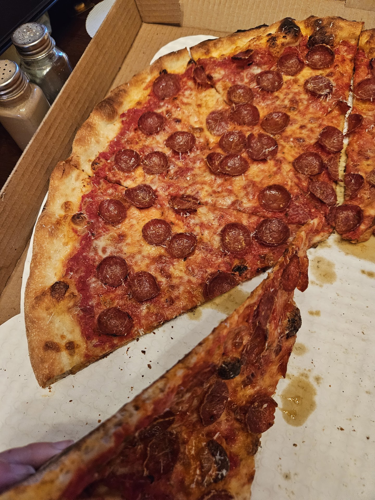 Read moreWas working in the area and they happened to be right around the corner so I called and ordered a pepperoni pizza and Parm breadsticks. Not knowing what to expect I went to get my food 20 minutes later and wow walking in what a great atmosphere then bam see the pizza counter tons of pizzas and bread sticks on display for sale by the slice made my mouth water. My pizza was not done yet so I got to watch them pull it out of the oven and hand grate fresh parmesan cheese over the giant pizza it was a good experience. The place is very clean. Very very professional and I give it 10 out of 10 for an in-person experience. Upon taking my food back to the job site and opening the boxes, what a surprise, me and my coworker both discussed the pizza as we ate it and decided it is top two if not the best pizza we have ever had. If you get one, definitely get there hot honey and drizzle a little on your pizza. It will...