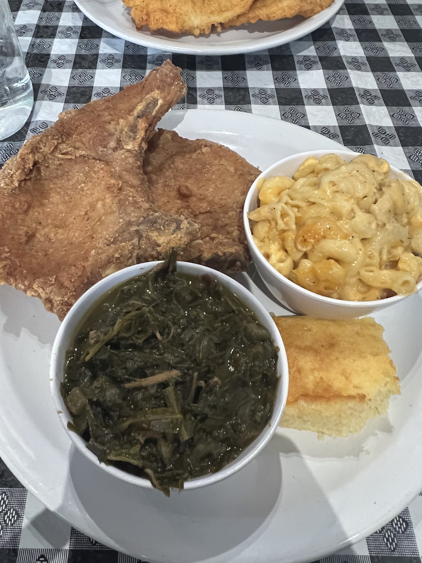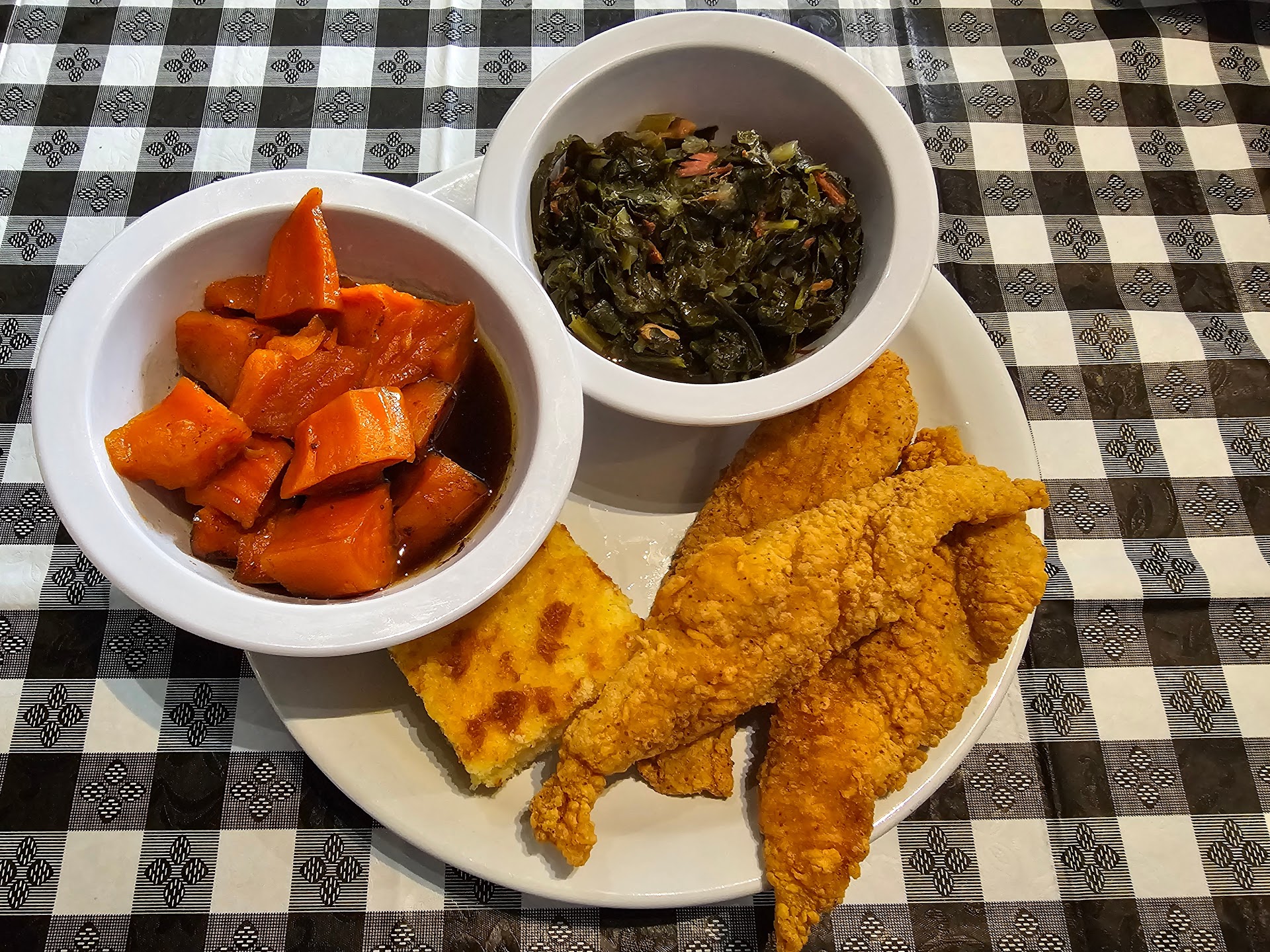 I ordered the fried pork chop dinner with yams, mac & cheese, and cornbread, and let me tell you, those pork chops were seasoned to perfection! đźâđš The entire meal was delicious, but I do have a couple of suggestions. The yams were perfectly seasoned and tasty, though I couldnât tell if they were fresh or from a can. The mac & cheese was good, but I think a different recipe and a baked version would really take it to the next level. As for the cornbread, Iâd suggest switching to a Jiffy or cornmeal baseâit tasted more like cake than cornbread.