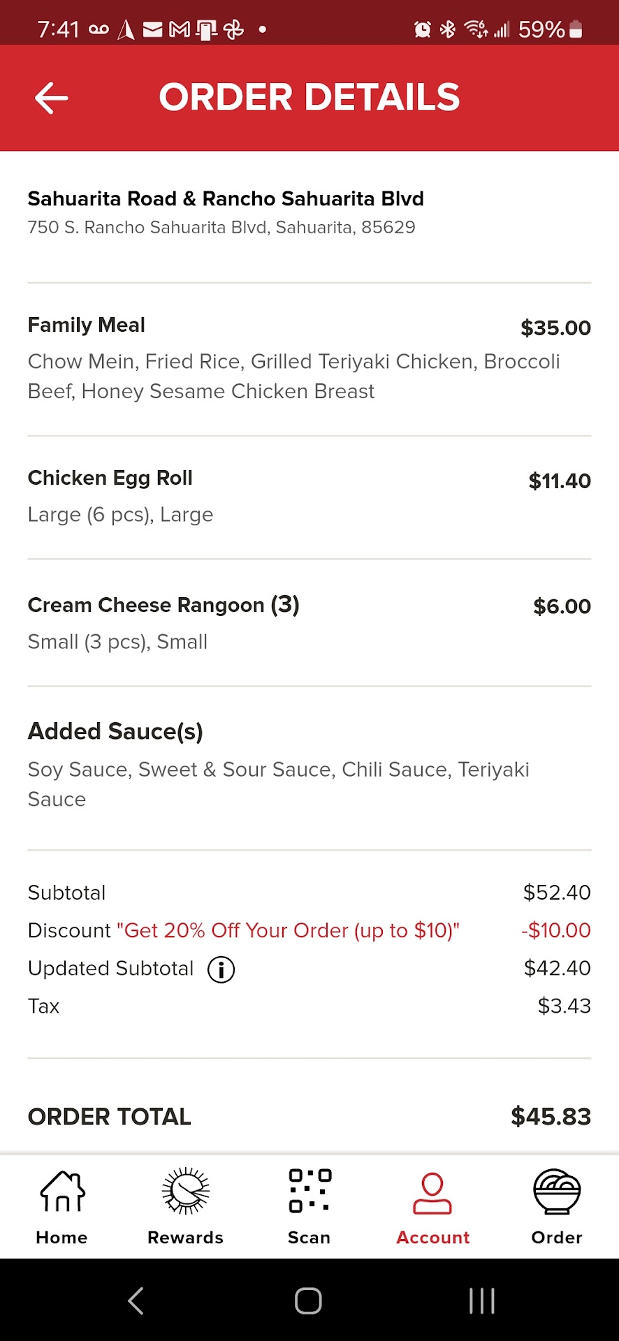 Read moreAgain!! No sauces! Why is it soo hard to remember to put sauces in a bag? Several times we arrived home to no teriyaki sauce for our teriyaki chicken! Last night I picked up 2 bowls of teriyaki chicken in the drive through and thankfully I checked as I have zero confidence the staff will put sauce in and guess what...no sauce and I specifically asked for sweet and sour as well as the teriyaki just to give them a reminder. When I told her there was no sauces she was obviously being bothered and even asked what kind of sauce to go with my, you know, TERIYAKI chicken!! They are in such a hurry to get you gone, they just don't care. Really to bad as the food is good. Just don't get it! But it always goes back to management and it seems the management at this location cannot train properly. Forget about calling them, they ain't answering! Again, poor training. Guess I'm switching to...