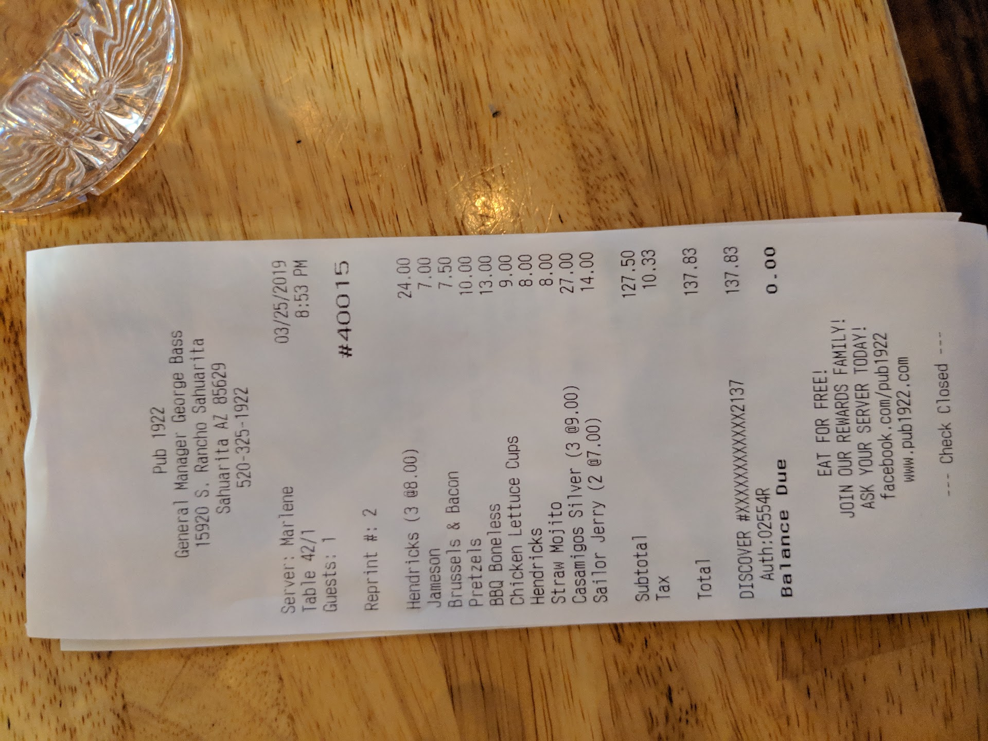 After talking to the server, this was the adjusted receipt. It still had more than we ordered. But we we're done trying to get then to fix...