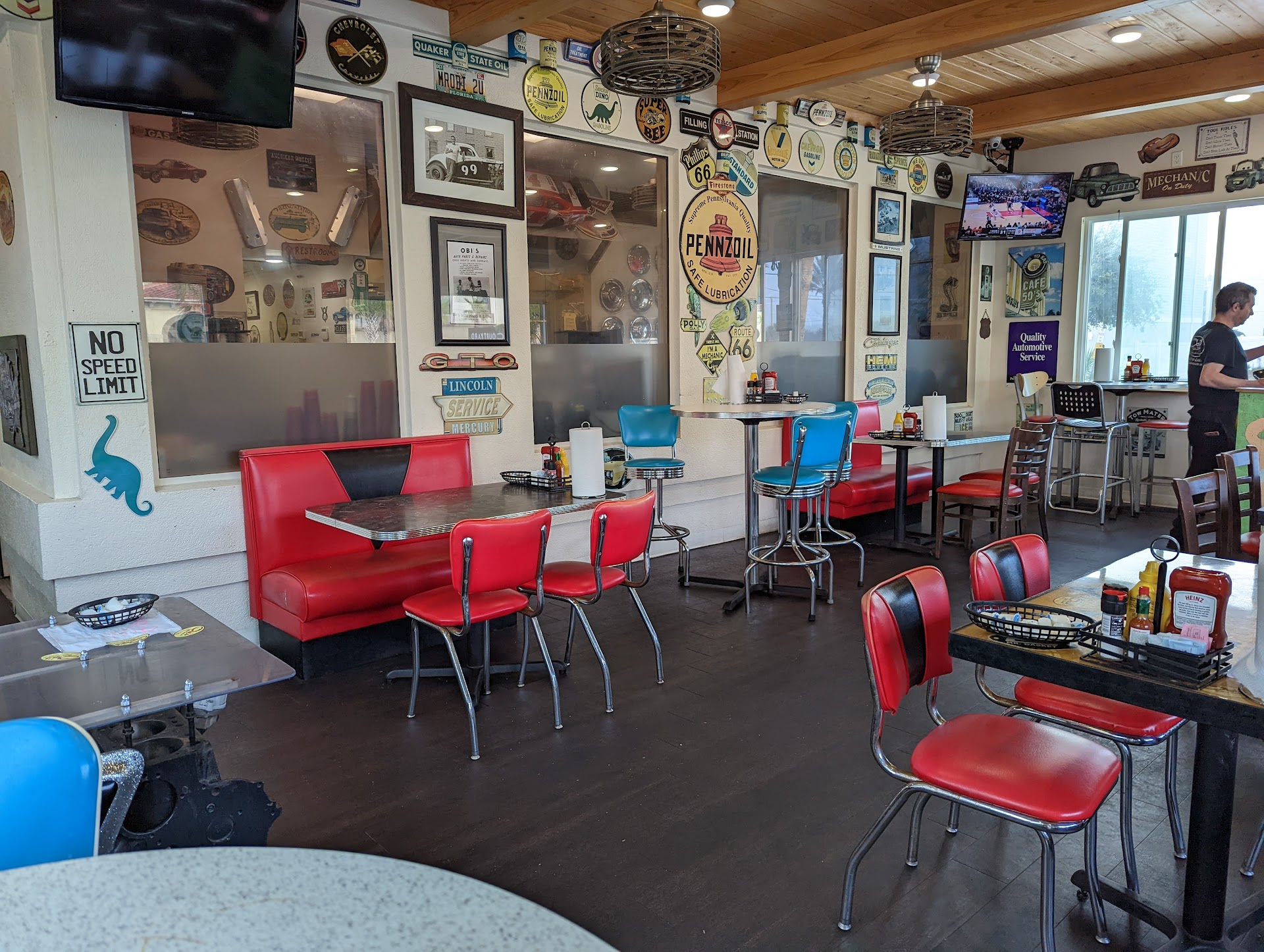 The location itself has enough paraphernalia hanging from the walls and on display on the floor to excite any car guy, or car gal. They even have a Fram oil filter subbing as a light from the ceiling (no kidding). This is about as good as it got for us.