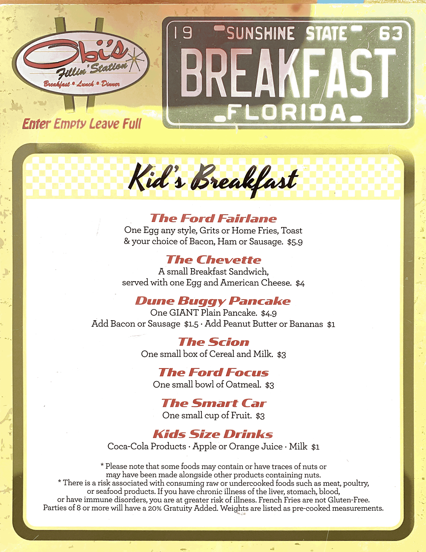 Obi's Fillin' Station is a gas station–themed diner that serves American fare, including burgers and breakfast, all amid car-part decor. The atmosphere is quirky and fun, with vintage car parts and memorabilia adorning the walls, making it a unique and enjoyable place to dine. An interesting fact about Obi's Fillin' Station is that it cleverly incorporates automotive themes into every aspect of the dining experience, from the menu names to the decor.