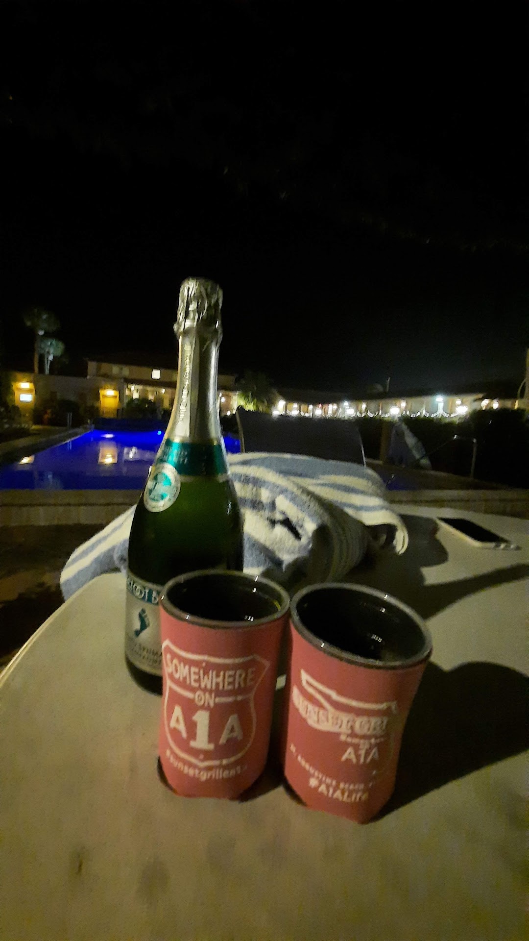 Then our Ahi tuna appetizer arrived pretty quickly thereafter. It was well plated and delicious. Comes over an Asian slaw, seaweed salad, and a wonderful soy based dipping sauce. Management came by and gifted us two bottle coozies which we used later in the night. 👍