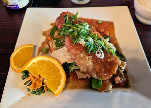 I was excited to see, among the Thai specialities, an unusual offering - "Crispy Grouper" - Florida grouper with the chef’s selection of sautéed vegetables and chili sauce. Since we were heading back to Chicago the next day, this gave me one more opportunity to have Florida grouper, while I could! And I'm glad I chose this - it was absolutely delicious!