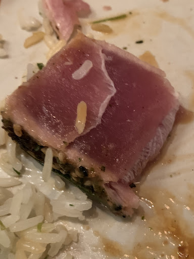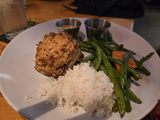 My wife's Slammin Salmon, priced at $35.00, featured overcooked rice with some uncooked grains. However, the crab-stuffed salmon was a positive aspect of the dish.