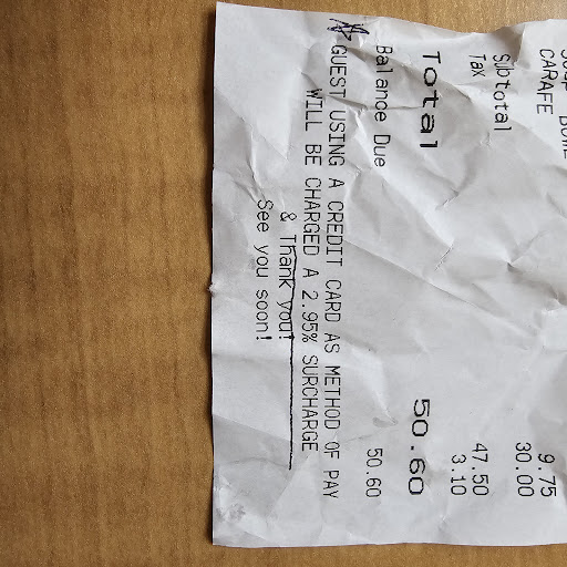 The food is a bit pricey, but the menu items we had was very good. 1 carafe of Sangria is $30.00. The Sangria was very good, again a little on the pricey side. The least expensive item on the menu is a cup of soup for $7.75. Sandwiches start at around $17.50 per item. The service was also very good, and the atmosphere was very unusual as it was in the pool area at the Lightner Museum. The only thing that turned me off from coming back here is the 2.95% surcharge that the restaurant applies to the customer use a credit card to pay. I disagree with restaurants trying to pass off the fees to the customer. Honestly the food prices are already expensive to begin with, so why don't they just add a 2.95% increase to the food and beverage items. Stop trying to nickle and dime your customers. We are no longer in a pandemic. Most people pay with a card, the surcharge is the cost of doing business and accepting a credit card as payment. Stop trying to pass off your merchant fees to your customers. This is the only restaurant that I have been to in St. Augustine that charges that fee to customers. Because of this practice we won't be coming back here again. What you are doing is forcing customers to take the 3% off the servers' tips, because you are being unnecessarily frugal. It is not fair to the servers working there, however it is also not fair to paying customers to eat your merchant fees. This is just an example of this business trying to cut corners at the customer's expense. Because of this sneaky business practice I do not recommend this restaurant, and won't be patronizing...