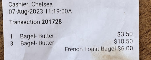 Read moreSuper disappointed, not with the food, but with the staff. I was the only customer in the shop but was treated like they were in a mad rush. The guy who took my order was unfriendly, snippy, and when he went to hand me my order slip, he let it go before I even had it and dropped it on the floor. No apology, just spun around to hand my order to the bagel maker and talk about changing the music that was playing in the shop, while I was picking up my slip from the dirty floor so I could give it to the cashier and pay. Then I was given my order in a bag, only to realize after I walked out to my car that it wasn’t my order, but must have been a phoned in to-go order. I walk back in, explain to the bagel guy that it must not be my order, was asked my name, waited a bit, was given my order without any “sorry about the mixup” etc etc.