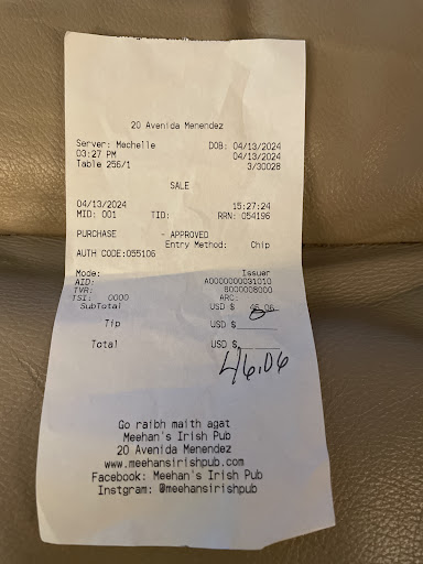 Samantha did refund us the credit card difference. That being said the food is always great and we have always had good service so don’t hesitate to go there and eat thank you. Apr 2024 On Saturday, April 13, my wife and I and another couple went to eat lunch at Meehan's. The waitress name is Mechelle came to our table and asked what we want to drink. She was very personable and seemed very professional. They appeared to be rather busy, but eventually she came back and took our food order. That being said, the food was delicious as it has been every time we have been there. her service is the afternoon went on and got worse and worse to the point we waited almost 30 minutes before she came back to see if she could bring us our bill. We told her yes, and then I left to go to a cigar shop to pick up a lighter, 35 minutes later, my wife and our friends were still waiting on her to bring the bill. They went to the front counter and the man at the front door got the waitress to go get bill. Our bills werecompletely transposed the wrong orders for the wrong bill. Mechelle said she went to see the manager to straighten out the bill and it is still not straight. On top of that, my wife was very frustrated after waiting, almost an hour to be able to pay decided not to leave her a tip. on top of having our bills messed up l have a copy of the receipt for $46. My wife's credit card got hit for $76.Mechelle never got the bill straight, then tipped herself for terrible service after supposedly getting with the manager. Very unprofessional and I doubt that we will ever go back. We go to Saint Augustine every year and every year we eat there and have been for 10 or 12 years, I would appreciate a response and the ability to speak with someone, thank you
