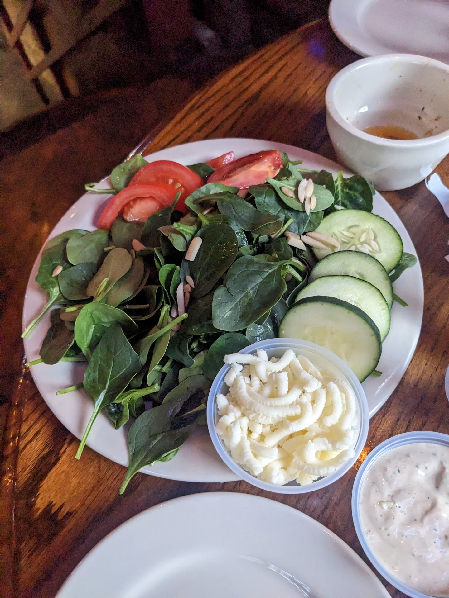 The server then brought me the ingredients of a salad. A dumped bag of spinach on the plate, huge chunks of cucumber, tomato lined on the side, a 1/4cup of pizza mozzarella cheese to the side & dressing to the side. 😱😢 I had to pick out molding, wet & wilted spinach, de stem the remaining spinach. The mozzarella was awful it's clearly pizza cheese or something, it was not any kind of mozz that should go on a salad.