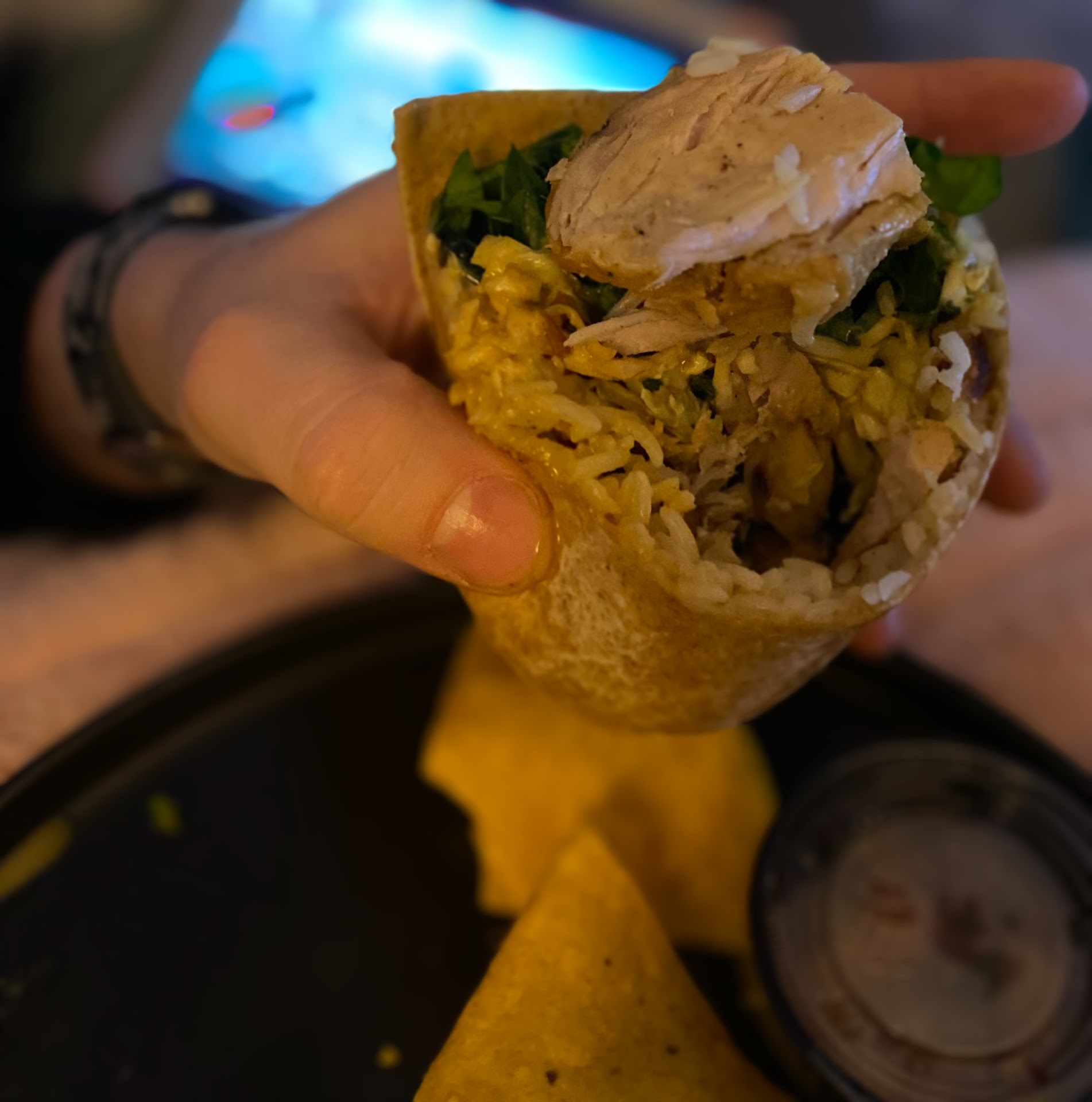 My wrap is completely drenched in sauce, the soggy wrap now impossible to pick up without the contents spilling out. Tastes really off.