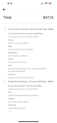 Here is the major problem. When my order came out I asked for Katchup and while they were grabbing that double checked the bag out of habit to ensure the gluten free bun was there. This bag only had the chicken tenders, fries, and sauce. My burger and bun were missing. I again politely told this to the young lady who brought out the food. Again Gen Z stare and “well the recipe on the bag says it’s there”. I proceeded to politely hand her my receipt and well as showing her the bag she had handed me to display that were were missing a few items. She again stared at me blankly for like 30-45 seconds before taking all the food back inside and bringing me back out the second missing bag with my burger and bun. When we get home we were missing mustard which had been input on the receipt so I didn’t think I needed to ask for it.