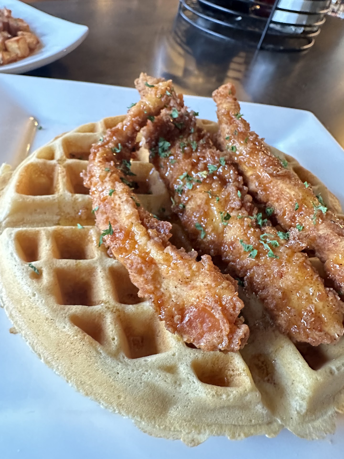 I definitely felt that it was more of a touristy place someplace where you would definitely want to check out but not go back to. upon arrival we were not greeted. Noticed by 2 staff but not greeted. They walked away taking and laughing as we were there in front of the hostess table and others also came in and we were all squished in the entrance waiting to be acknowledged lol We usually don't care, but then we were told it was gonna be a fifteen minute wait while there was empty tables there. Once we got a text that a table was ready. We noticed that everybody who got there before us had already been sat. (Where? In the empty tables) We don't like to pay attention to things like this, but we I didn't like that.It was a second strike type of deal. We ordered the chicken and waffles. And biscuits with fried chicken. I will say the chicken and waffles. The taste was delicious, very fresh and just the right amount of spicy. The chicken and biscuits came with a side of potatoes that I couldn't get enough of. we also ordered a Coke and a Cold Coffee, which both tasted horrible, really. We didn't get charged for the cokes. If we didn't drink it, it's, but the coffee was just as bad and it was about 5-6 dollars.I don't remember. This place is pretty, but unfortunately, it was so hot, I was actually sweating. It's like they don't want to spend on the electricity bill. Anyway, I...