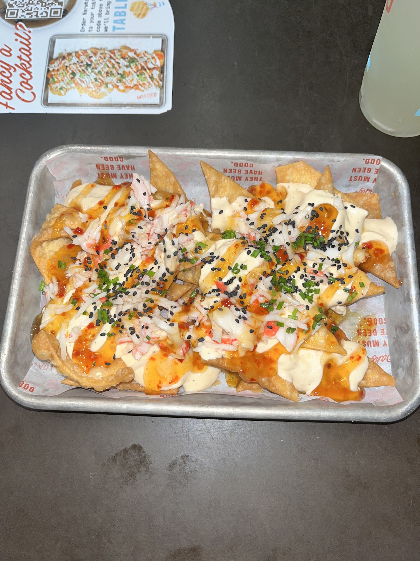 I had wanted to try this place for a very long time. A friend, my daughter and I happened to be in the area for an event so we went here after. We orders two sharables which gave us 4 small plates to try. We chose the crab rangoon, BBQ pork nachos, Korean BBQ and Hawaiian - we figured that would give us a nice sampling. The staff was very friendly and patient with us taking our sweet time to figure out what we wanted, asking all the questions etc. The restaurant itself wasn't what I expected.... more like a qdoba type place than a sit and have a restaurant experience type place (that was my bad for assuming it was something it wasn't). So for the food..... We were all pretty disappointed overall. We will start with the best one - all three of us rated the Crab Rangoon Nachos the best of the 4: tasted like they should, had the right amount of topping, chips were crisp. As for the others we were pretty disappointed in all of them for one reason or another. First the meat on each one - none of the meat alone had much flavor. the BBQ pork you would expect to have a nice juicy smoky flavor but it was pretty dry and flavorless. the Hawaiian had the chicken which we expected again to be juicy and possibly a smoky pineapple type flavor but it had no flavor at all - in fact, before we tasted it, one of us thought it was the crab meat because it looked more like what you would see out of a grocery store can of crab meat (VERY VERY SHREDDED) and last the Korean we expected to taste well - like Korean BBQ meat. It did not. The other toppings all seemed fresh. The chips were crispy on each. We were just all very unimmpressed with the food flavors. All of us concluded we would not be back if given a choice. Such a disappointment because we had such high hopes for this place. Like others have mentioned the pictures look 10X better than the food...