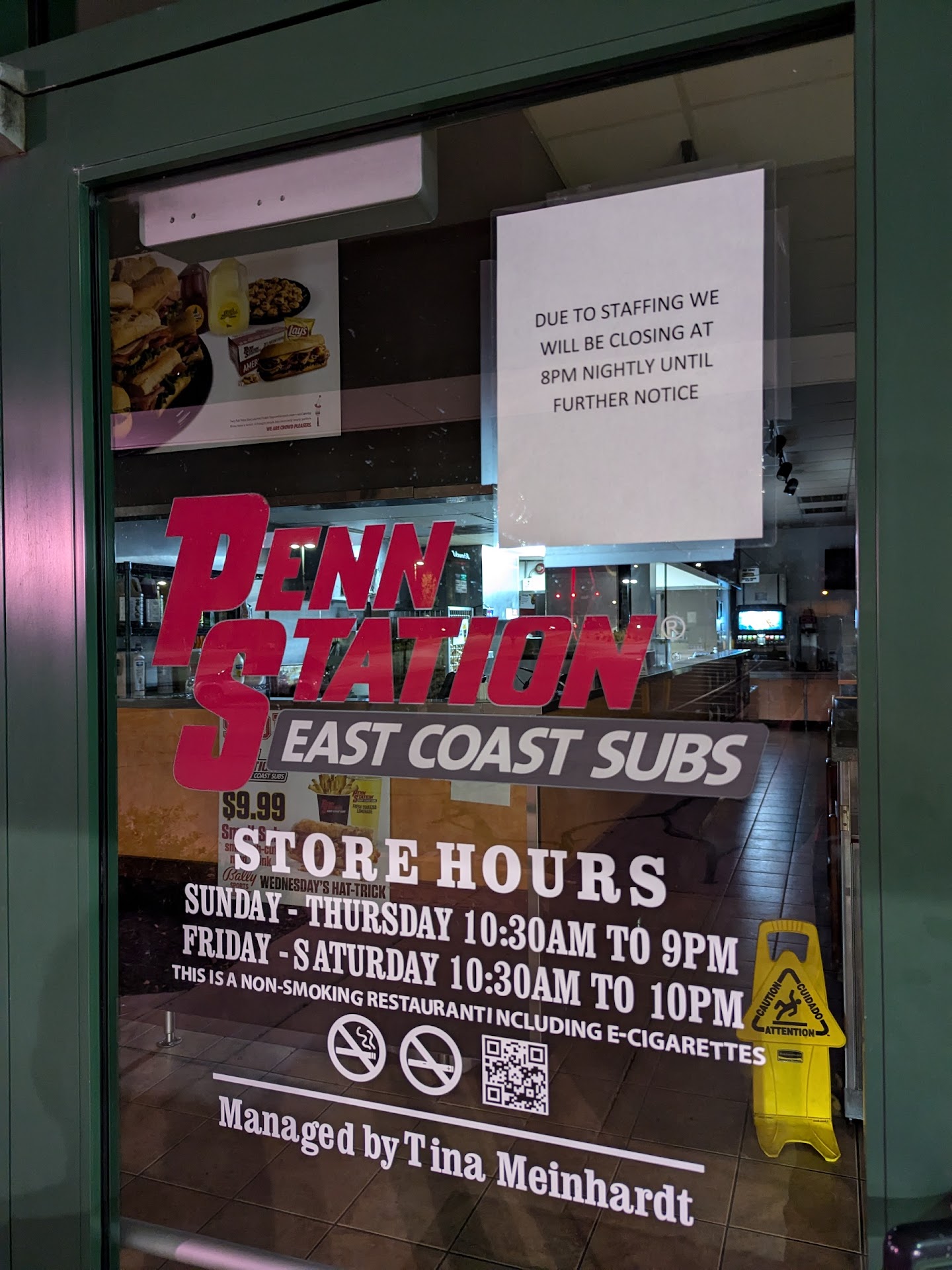 Read moreI've always been a fan of Penn Station, but my last experience at this location (maybe 2 months ago) has ruined it for me and I won't be coming back. Employees were not wearing masks. They're preparing food without wearing masks. I asked the girl at the counter why they weren't wearing masks and she said the company doesn't require it. Well, sorry, I require the people who make my food to wear masks. All of the customers were wearing masks, it was just the employees who weren't. I had placed my order online, otherwise I would've just left but I had already paid. Arrived about 10 minutes after placing my order, was told it wasn't ready, waited in the store for a half hour, and then asked for a refund because I never got my food. Girl at the register looked like she was going to cry because it turns out my food was sitting on the counter behind her the entire time. Another customer complained about his wait time and when he left the employees were very loudly talking negatively about him for all the customers to hear. God only knows what they said about me after I left. Your entire company lost me as a customer from...
