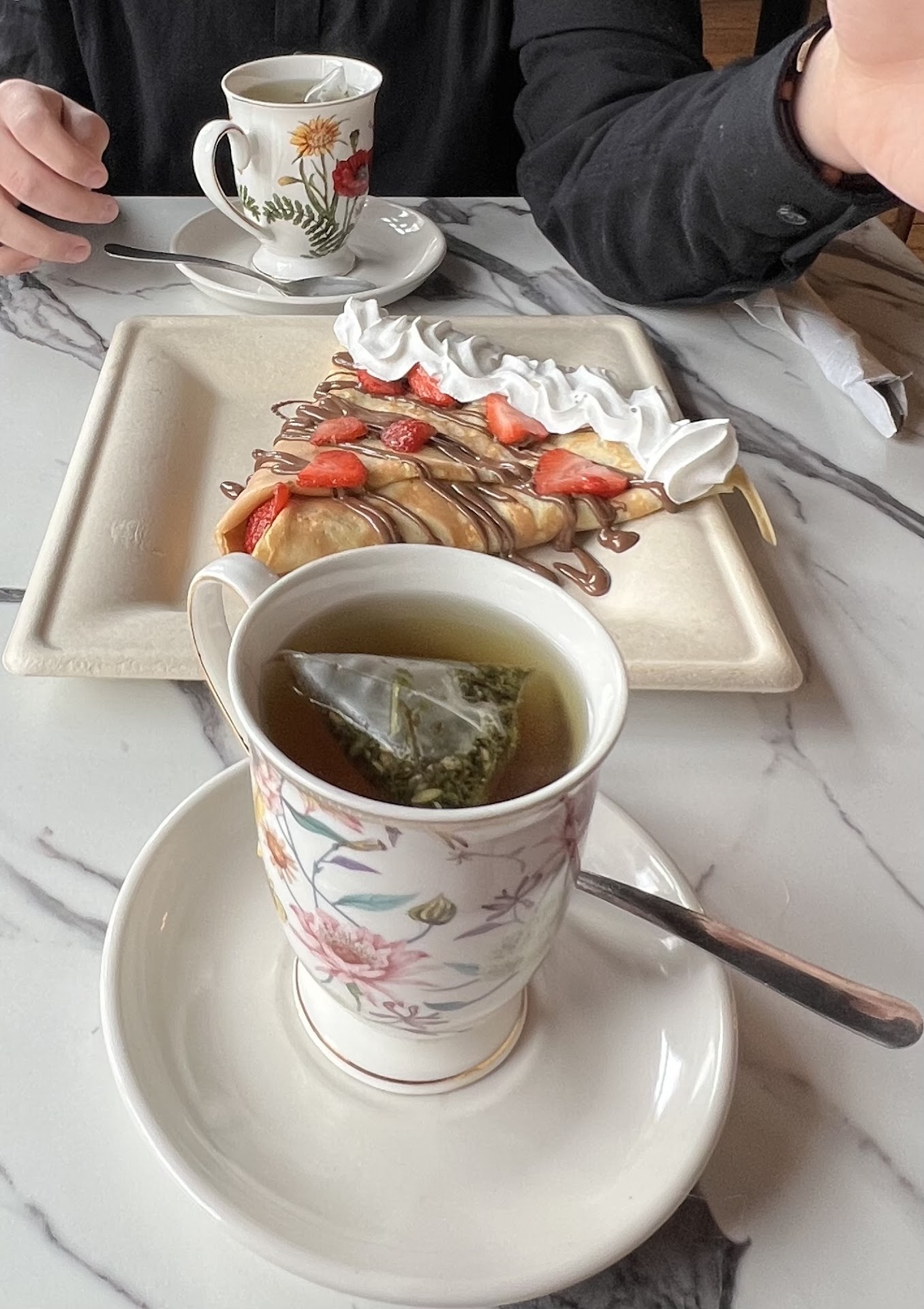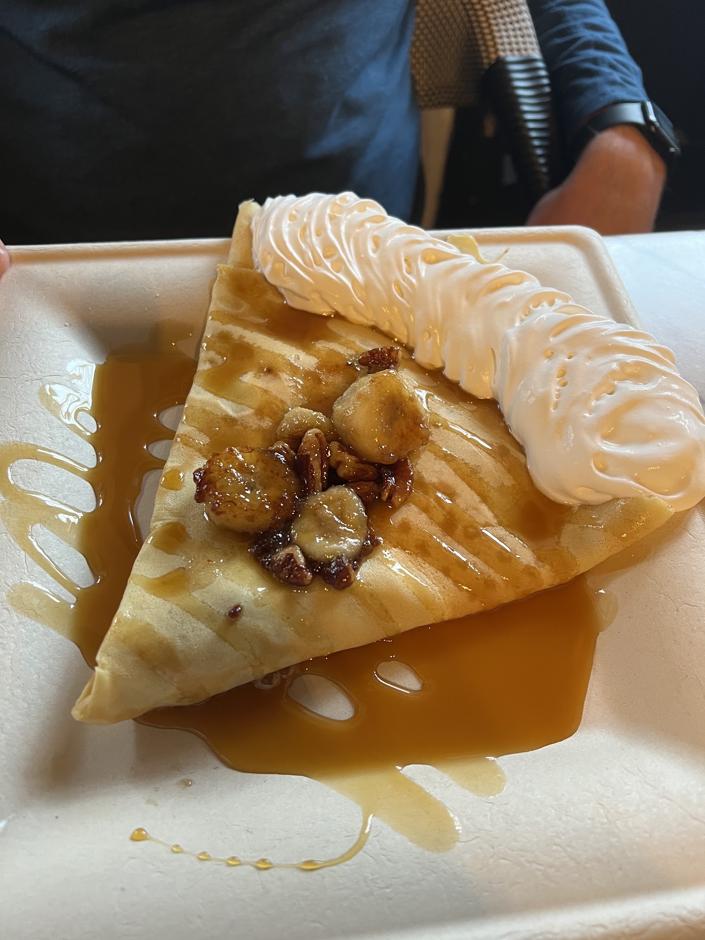They serve in assortment of savory and sweet crepes as well as pastries, coffees, teas and assorted other things.
