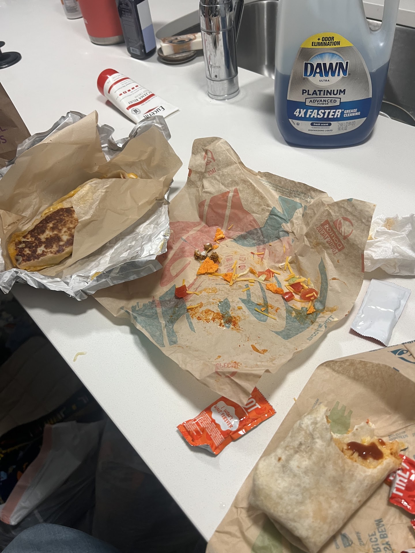 And my food was alright, but definitely the worst I've had from taco bell. My crunch wrap was flat like a pancake for some reason. At first I thought I was given a quesadilla by mistake, but no. It was my crunch wrap. They did leave the sour cream off like I asked, so that's something to be happy about I suppose. And my Nacho fries were fresh, but way too much seasoning. It was to the point where it was kinda gross to eat.