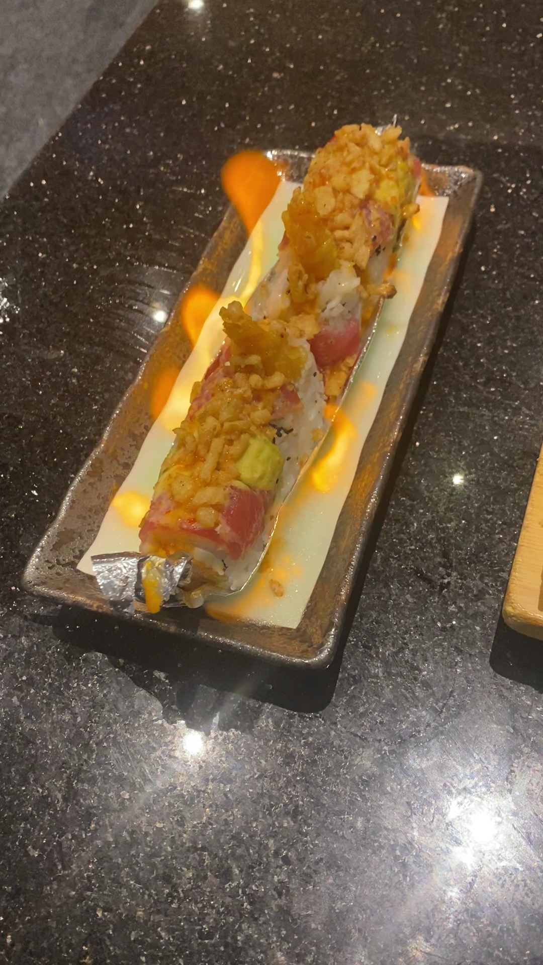 The first bite is an explosion of taste â the spiciness of the salmon interwoven with the velvety, sweet embrace of the honey glaze creates a delightful paradox on the palate. The spicy salmon, bold and with an assertive kick, is immediately tempered and complimented by the mellowness of the honey glazed salmon. It's a dance of fire and nectar, a yin and yang of flavors that play off each other beautifully.